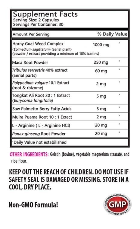 HORNY GOAT WEED COMPLEX: Our powerful dietary supplement designed to support a balanced internal environment and promote optimal well-being. This advanced formula combines the natural benefits of Maca Root, Tribulus Terrestris, Polypodium Vulgare, Tongkat Ali, Saw Palmetto Berry, Muira Puama, L-Arginine, Panax Ginseng Root with a blend of potent ingredients known for their properties.