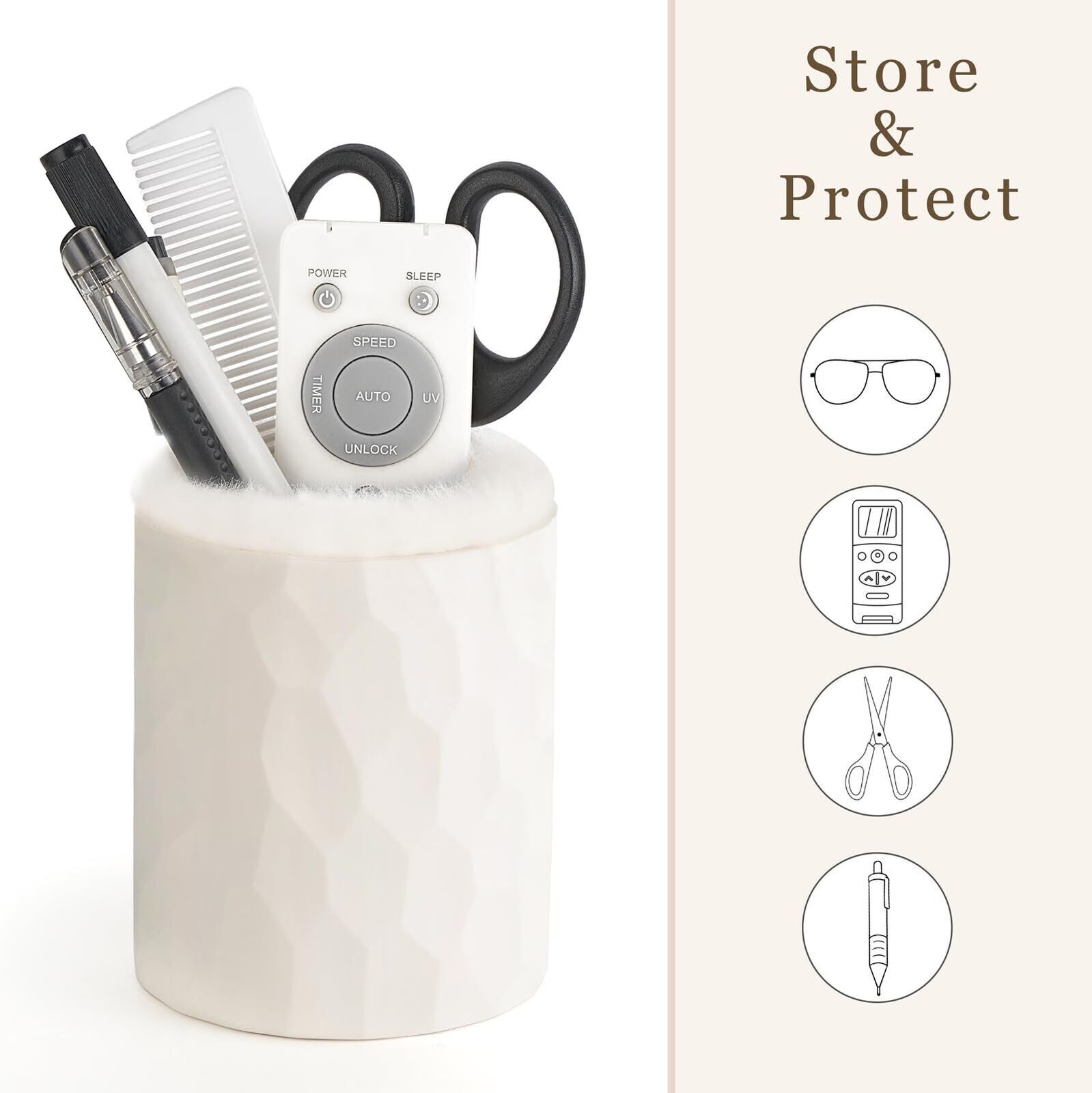Color: IvoryFeatures: Suitable for most standard size glasses or sunglasses, protecting your expensive glasses and keeping your eyeglasses safe all the time. You will never spend countless time looking for your glasses. The upright construction of the glasses stand allows you to easily and safely store your glasses in a fixed position, which can be placed on a nightstand, coffee table, desk, or any flat surface in the office. Keep it within easy reach for convenient access. Designed with a special soft furry lining, this glasses holder can protect your lenses from scratches, dirt and residue, also great for protecting the arms of your eyeglasses from bending and breaking. You can put not only eye glasses but also remote controls, pens, scissors, rulers, and other items in this multi-function stand holder. Organizing your desktop to make your room or office look cleaner and more elegant. The minimalist and stylish design is suitable for all home decor styles. The eyeglass holder stand is an ideal gift for your family, friends, and colleagues. It can also be used as a warm and perfect gift for birthdays, Valentine's Day, Thanksgiving, Christmas, New Year, and back-to-school season. Package Dimensions: 5.2 x 3.8 x 3.4 inches