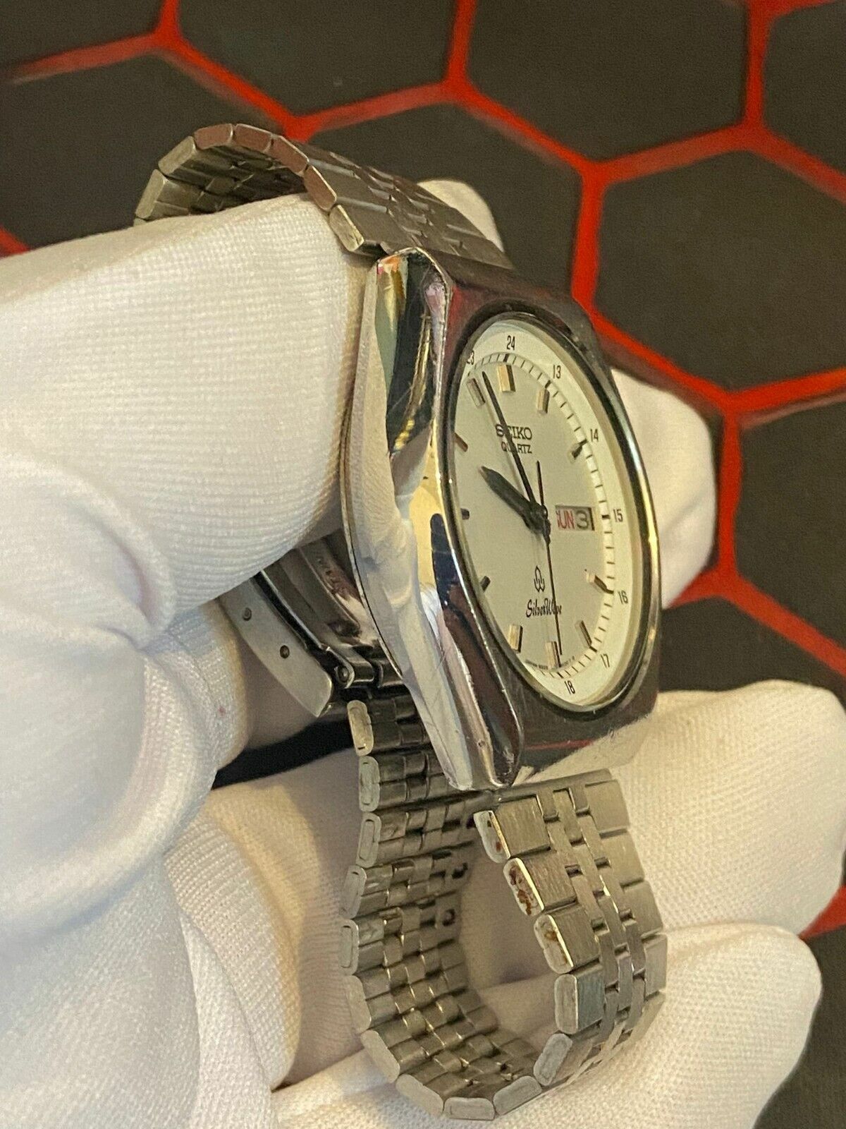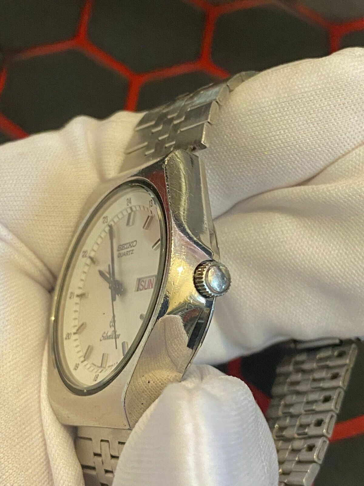 - This is a used item. There are fine scratches, but overall it is relatively beautiful. There are no noticeable scratches on the glass surface. Please judge from the photo. The watch features a white dial with a Kanji day-date display, characteristic of Seiko's JDM (Japanese Domestic Market) models. It is noted for its vintage appeal, typically from the 1980s.