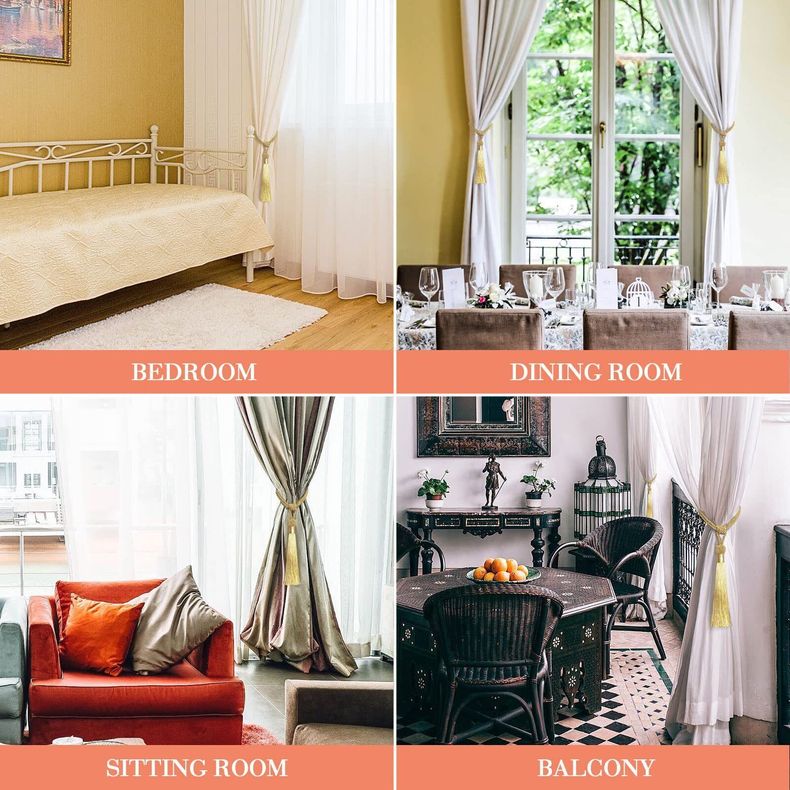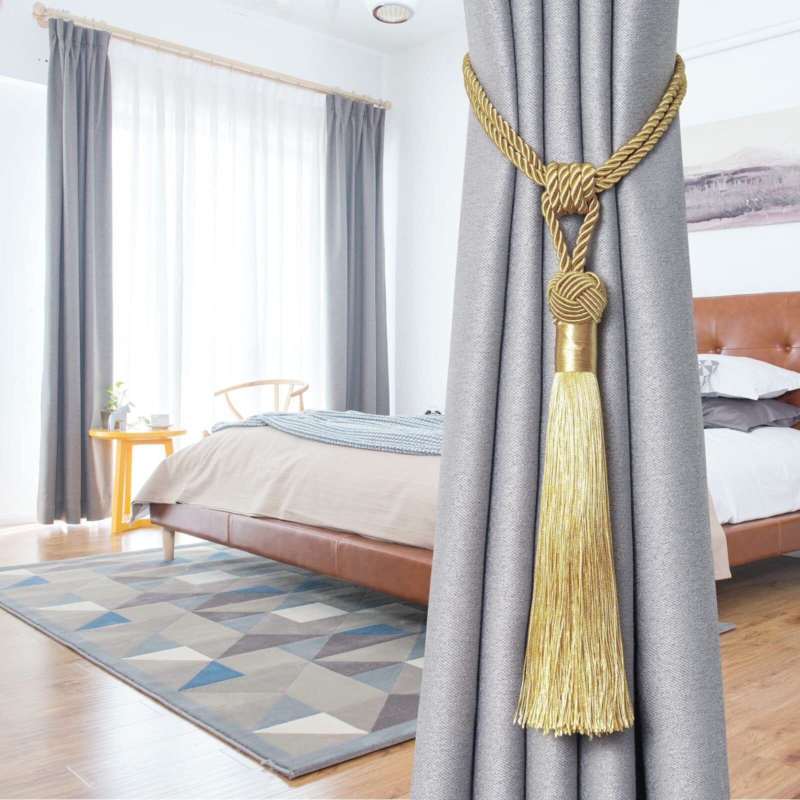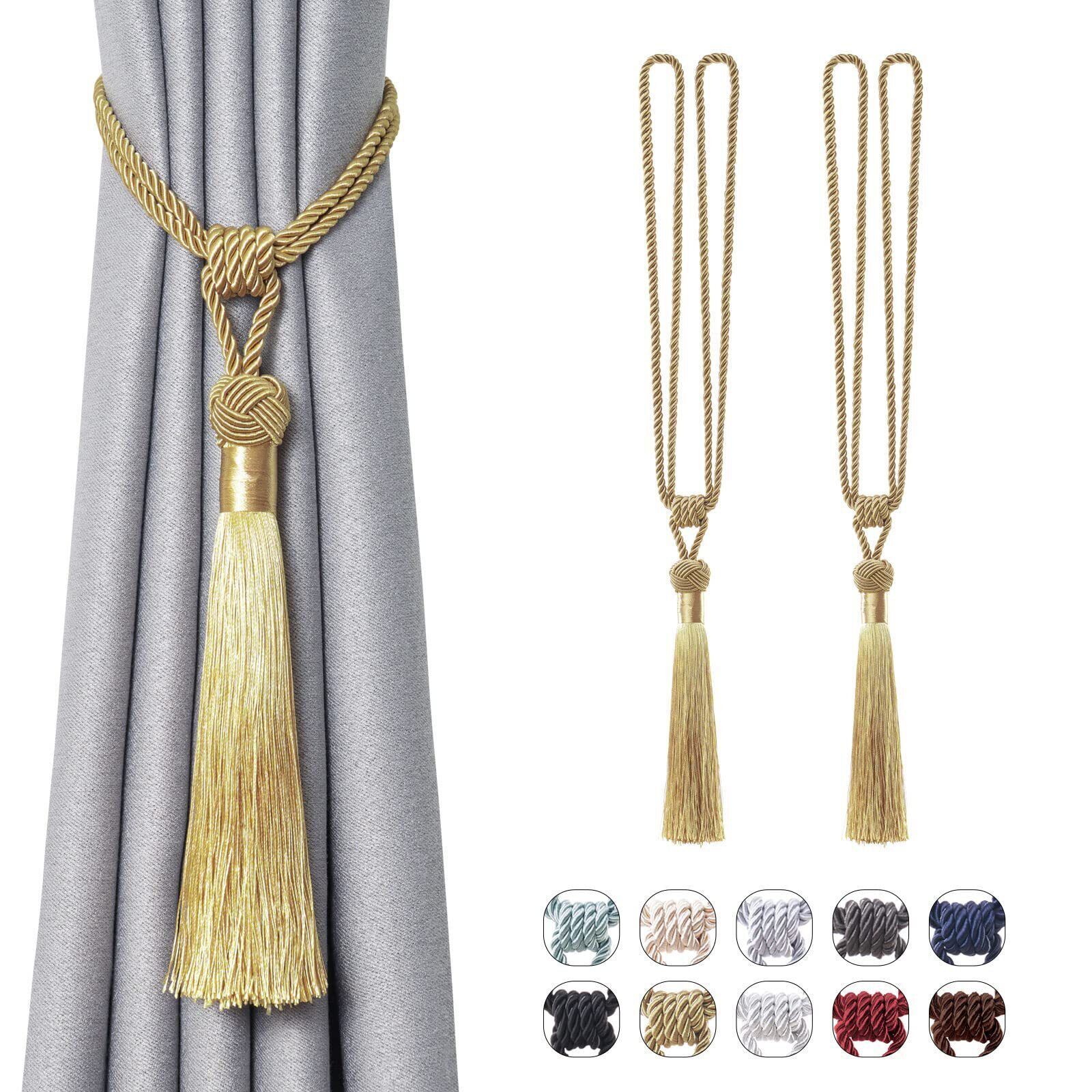 Color: GoldFeatures: EXQUISITE MATERIAL: Beautiful tassel tiebacks are made of strong polyester rope and shiny tassels, with a similar luster to silk, full color, soft and not easily worn or pilling. The sphere is hand-woven with multiple polyester threads, has an attractive retro appearance EASY TO USE: You can directly tie up your curtains in your favorite way, or you can also use a hook to fix your curtain tie backs.According to different thickness of curtains, you can use different binding methods. If you have a more beautiful way of binding, welcome to share with us. Let us see your rich imagination SUITABLE DIMENSIONS: Weight of 1 Pair:168g/0.37 lb, Total Length: 21.7", Tassel Length: 8.3", Rope Length:13.4". NICEEC tassel curtain tiebacks are lighter, and will not slip off due to heavy weight during use. In addition, the length of our curtain holdback is long enough to fix curtains of different thicknesses WIDE APPLICATION: Different colors of tie backs for draperies dot your curtains, can change different styles, giving the curtains a unique charm, widely used in bedrooms, living rooms, dining rooms, bathrooms, kitchens, offices and other places. You can not only use it on curtains, Can also be used on door handles, Can be tied to the bag, Can be placed in any corner of the house, All a nice decoration REST ASSURED PURCHASE: NICEEC is committed to providing customers with quality products and caring services. If you have any questions when using our products, you can let us know by email and we will answer you as soon as possible. If you are not satisfied with our products, we promise a 100% refund. Customer satisfaction is our greatest pursuit Package Dimensions: 11.3 x 4.8 x 1.9 inches