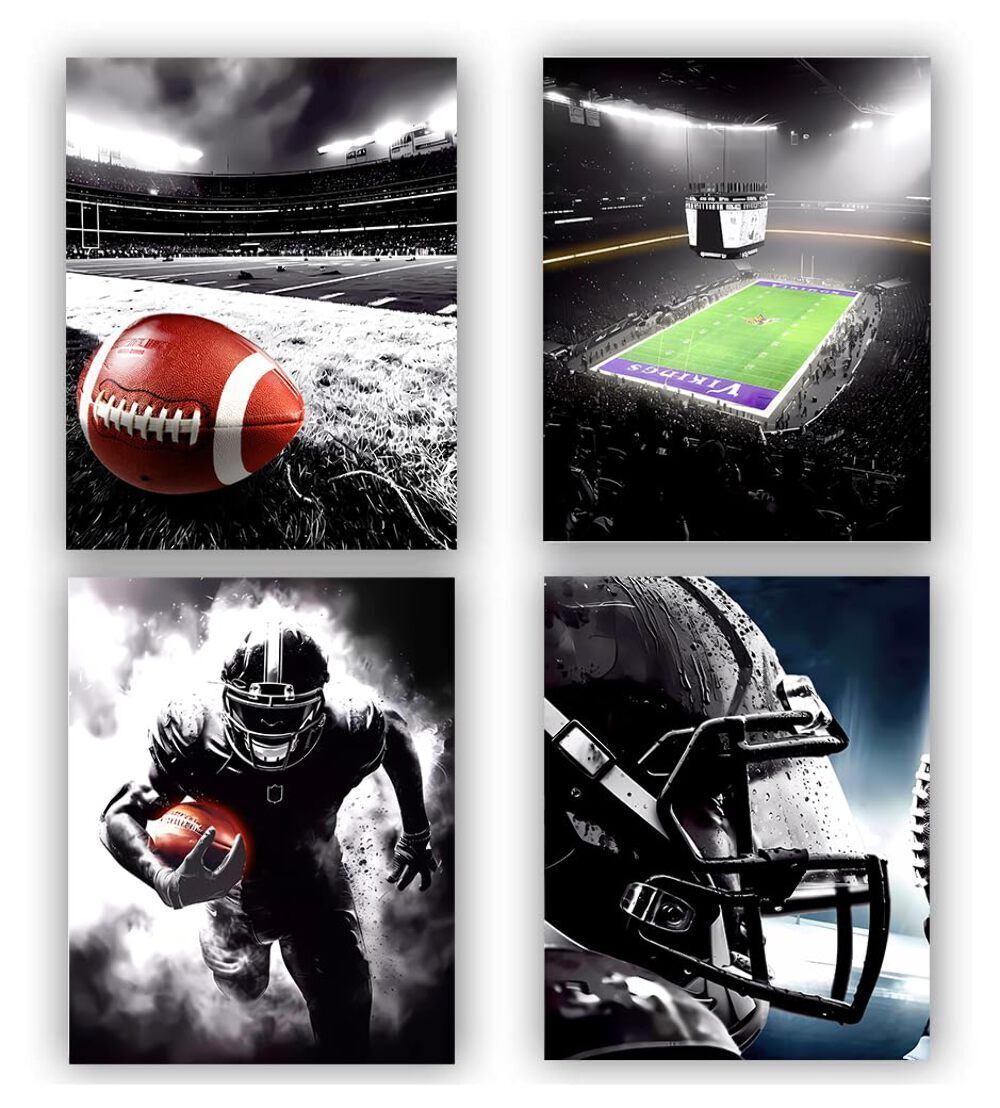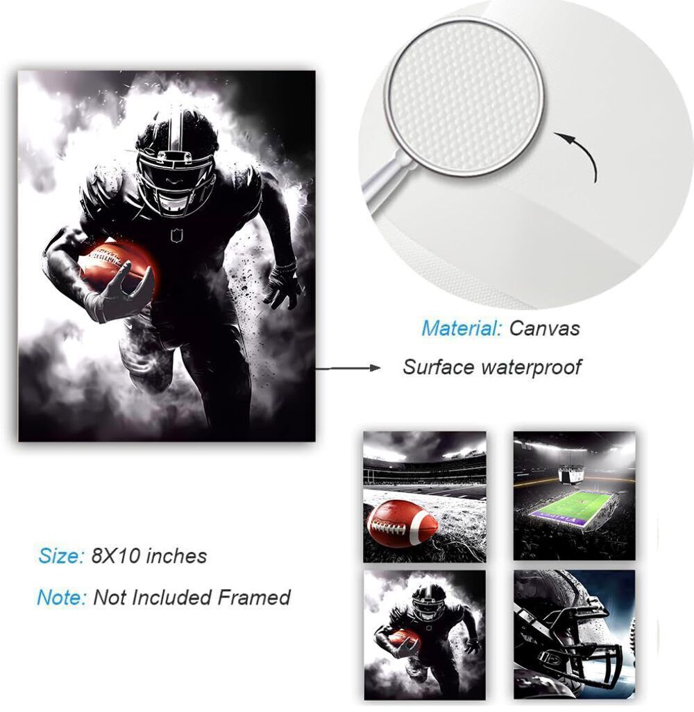 Color: Unframed-8"x10"-american Football Sport Canvas Wall ArtFeatures: ???FASHION FULL OF YOUR OFFICE?:Do you want to change the decoration style of your room? Our American Football Art Prints is 100% brand new and high quality and durable in using and easy to operate, so our product is loved by the mass. Combined unique,The solid colors against soft pastel backgrounds emphasize each illustration . it can also instantly decorate your home and make your room's atmosphere more Amorous feelings? ???RECOMMENDED DECORATION?: High definition Finely Crafted Inspirational Rugby Art Poster decor you will be proud to hang on your walls. on high quality canvas. Whether you're creating a gallery wall or hanging them indivually and far apart, these wall prints are motivational pieces that add an empowering message and raises consciousness of any viewer. Share your awareness by hanging this motivational wall art in any room. suitable for decoration in the living room, office, bedroom, guest room, art room, study room ???ABOUT THE MATERIAL?: As its exquisite design, a thoughtful gift for any occasion. Perfect gift for graduations, birthdays,Christmas and housewarmings. Makes thoughtful gifts for best friends,classmates and colleagues. We hope that it is not only painting, but also an artwork that lights up your life . ???EASY TO MATCH?: This product has no frame, Prepare your favorite frame, our paintings are perfect with 8? x 10? frame. It?s ready to use with your favorite picture frame to bring instant home decor style into any room in your house. It takes only a few minutes to decorate your home perfectly. ???FASHION PRINT SIZE?: American Football Sport Wall Art Posters is 8? X 10? (20cmX25cm)There may be an error of 2-3mm during the cutting process, total 4 pcs, No Frame. Our product mailing service is provided by Amazon. Details: You want your room decorated full of unique and artistic right? Right, our prints may be a good choice? 1. American Football Sport Canvas Wall Art American Football Art Prints Rugby Art Poster . ?Package included:4 canvas wall pictures (No frame, 8X10Inch)