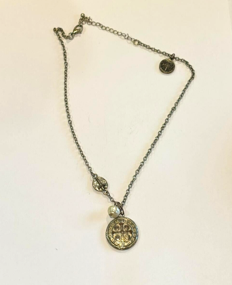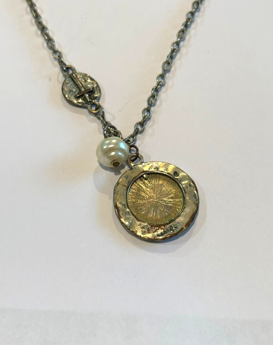 Vintage Style Silver Tone Necklace Round Medallion Pearl Accent