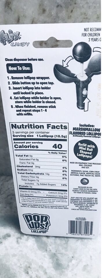 Flix Candy Easter Peeps Pop Up Lollipops! Each comes with a lollipop holder and 3 marshmallow flavored lollipops! Now available as the newest "lollipop toy" that protects your lollipop and keeps it clean and safe. It's the perfect basket stuffer! Kids can play with their toy POP UPS after they eat the lollipop. Collect them all, eat play!