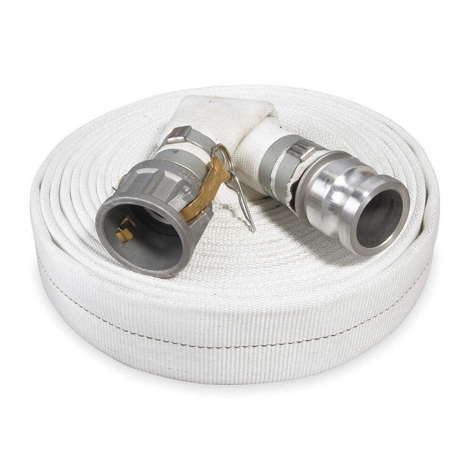 Water Discharge Hose, Hose Inside Dia. 3 in, Hose Outside Dia. 3 3/8 in, Hose Length 50 ft, Hose Color White, Hose Tube Material SBR, Hose Cover Material Polyester, Burst Pressure 375 psi, Max. Working Pressure @ 70 F 125 psi, Temp. Range -22 Degrees to 180 Degrees F, Hose Reinforcement Type Braid, Hose Reinforcement Material Fiber, Safety Factor 3:1, Hose Fitting A Size 3 in, Hose Fitting B Size 3 in, Hose Fitting A Material Aluminum, Hose Fitting B Material Aluminum