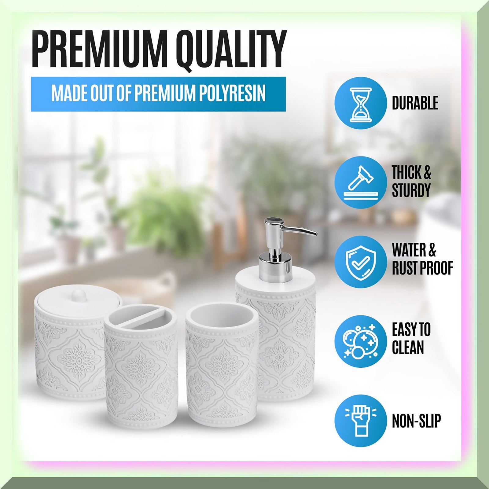 This 4-piece bathroom accessory set includes a soap dispenser, toothbrush holder, tumbler, and cotton holder. Made from durable resin, each piece features a sleek, modern design. The set provides essential accessories to enhance your bathroom decor. The items are lightweight for easy handling and simple to clean. Perfect for organizing your bathroom essentials, this set combines functionality with elegant style.