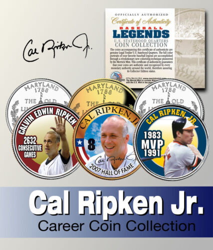 Here is your chance to own a CAL RIPKEN, JR. Postmarked Final Game Envelope in Folio Official Retirement Logo Maryland Statehood Quarter. Features Exclusive Postmark Envelope from date of historic event, October 6, 2001 which commemorates his final game. Included is a Cal Ripken Jr. official retirement logo Maryland Statehood Quarter in a color event card. These high-quality, genuine Legal Tender United States coins have been colorized using a unique painstaking multi-color authentic process by the Merrick Mint. Colorizing coins involves the unique application of special inks directly to the surface of a coin that achieves a level of detail, color saturation, and durability that is #1 in the coin industry. The result is an everlasting colorized coin collectible of ultra-high quality.