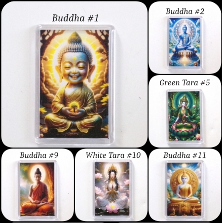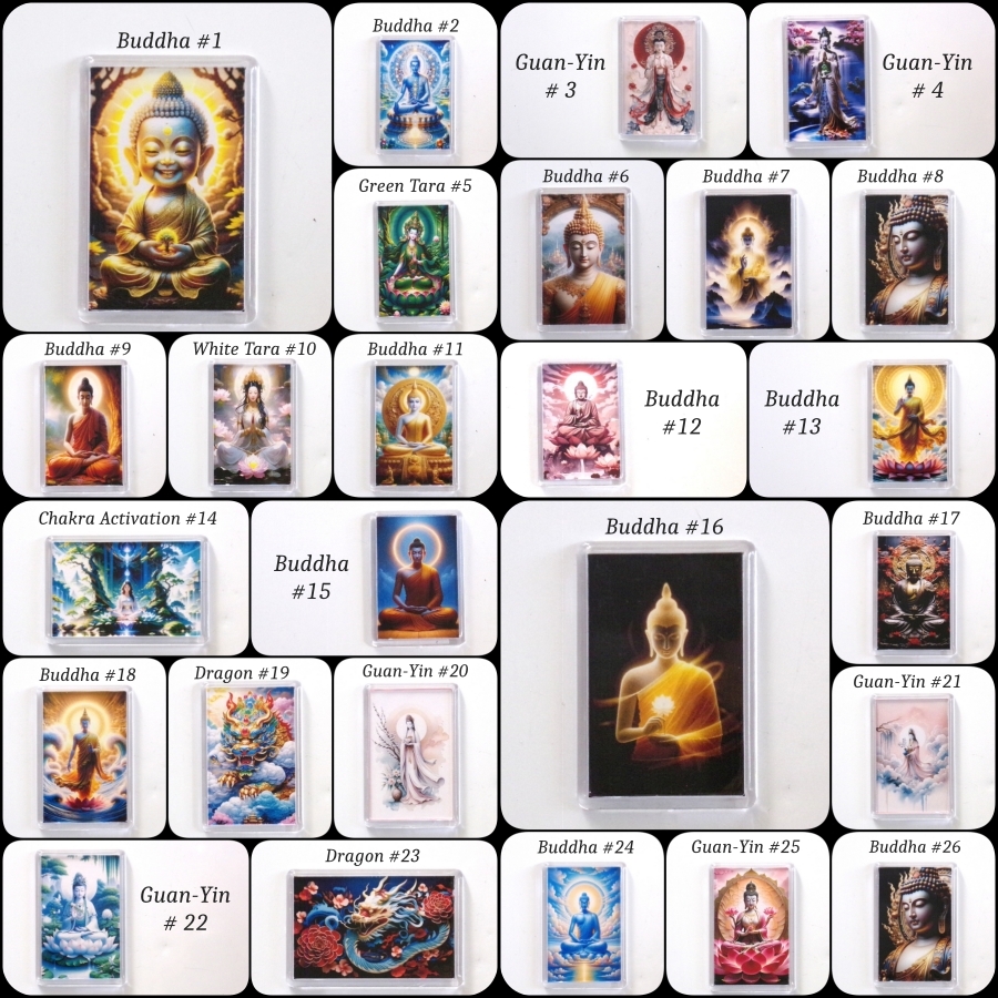 Celebrate the season of giving with these hand?crafted acrylic fridge magnets featuring Buddha, Guan?Yin, Dragon, and Tara.