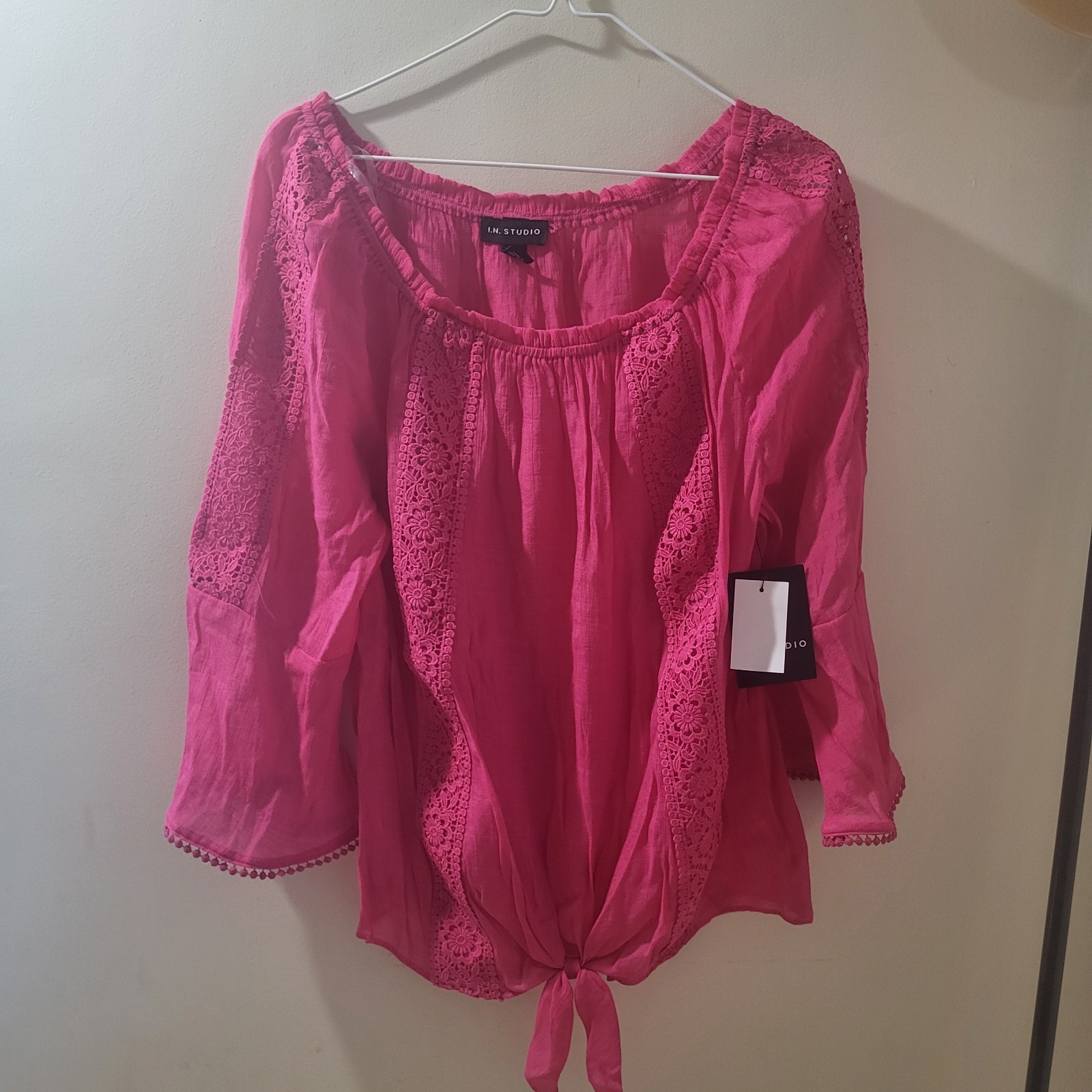This hot pink blouse is still new with tags! Pit to pit measures approx 21". 62% rayon 38% polyester. Has 3/4th bell sleeves