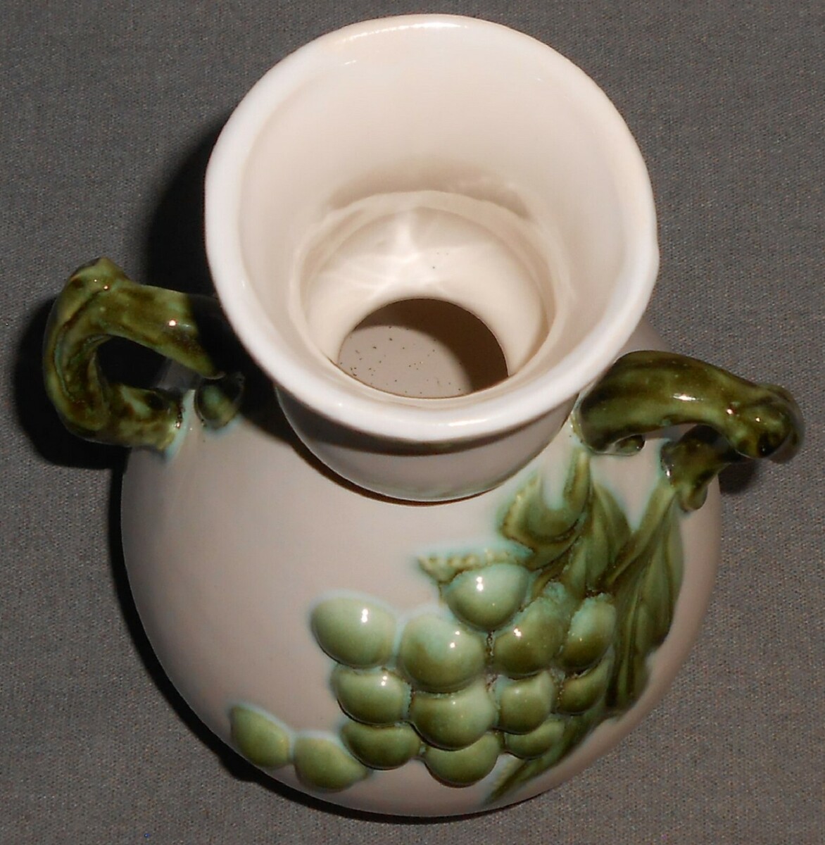 This is one of the Eames influenced 1950s Hull Pottery designs that is a Bulbous Shaped Vase with Grapevine Handles and Grapes Motif and has the White and Green color combination and it has the incised mark in script on the bottom though it is hard to read - looks like a #8 and "Tokay" and "USA". I think the pattern is called Tuscany but I also see it referred to as Tokay. It measures approx. 10 1/4" tall x 3" across at mouth and it is in good pre-owned condition with no chips or cracks.