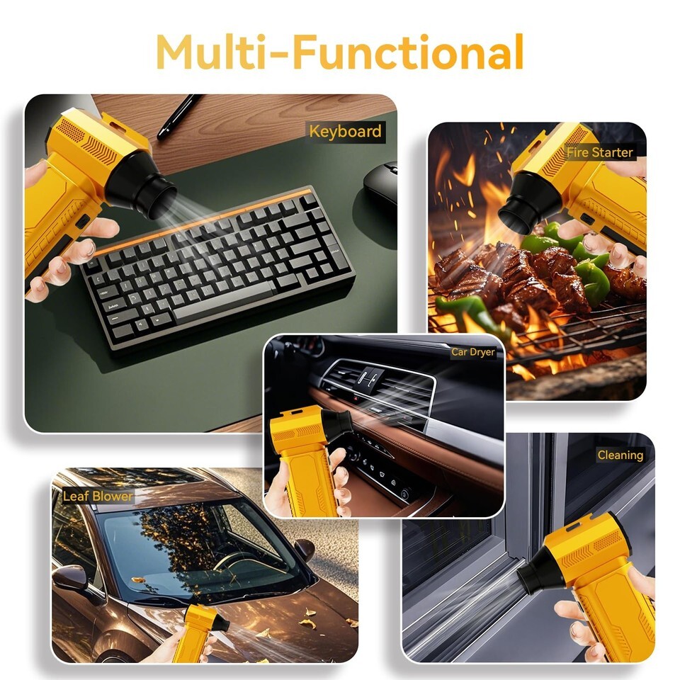 ??Wide Application?Our dust blower comes with 1 nozzle and 10 different brushes for various cleaning needs. Suitable for blowing leaves, dust and debris on hard surfaces like garages, workshop, computer, keyboards, desktops, fax machine, printer, window crevices etc. Also perfect for speeding up BBQ fires and blowing snow.