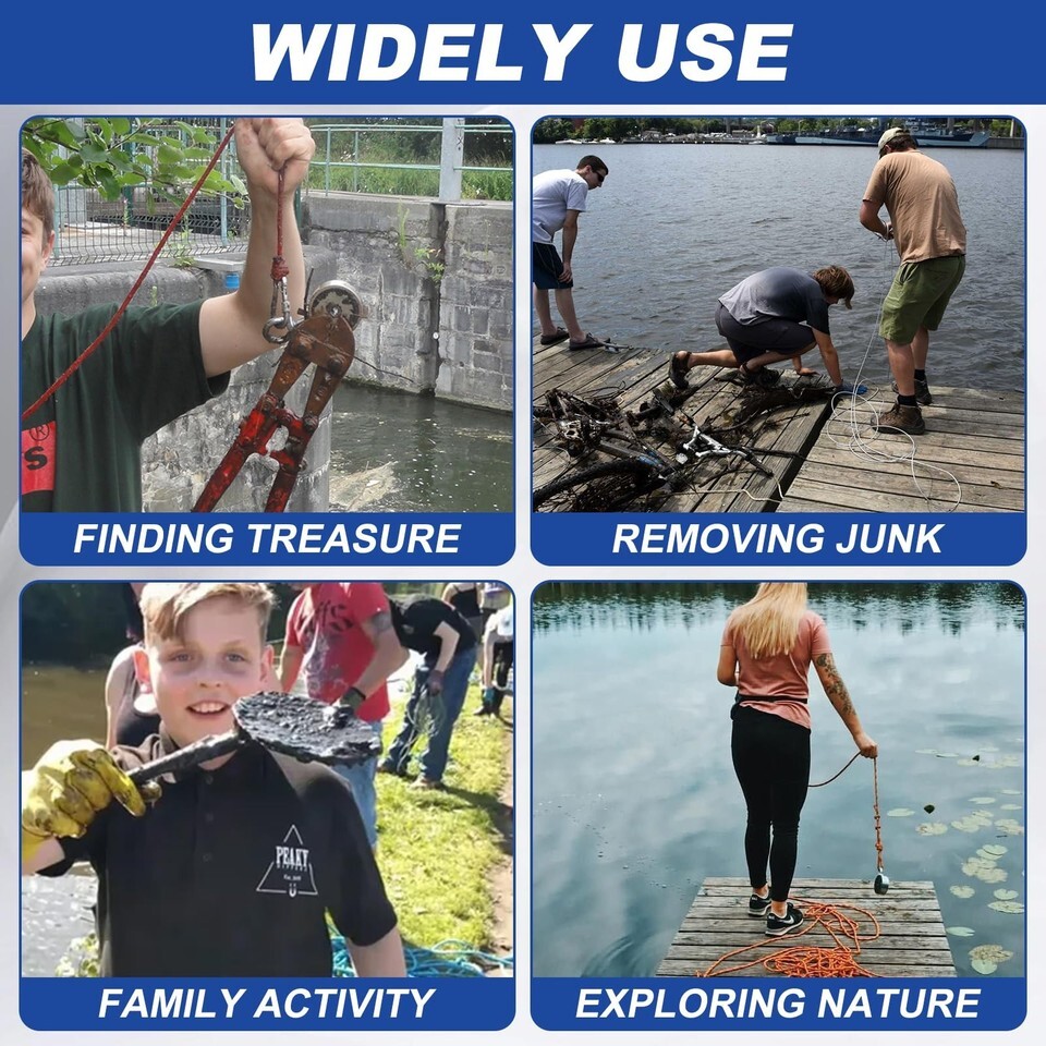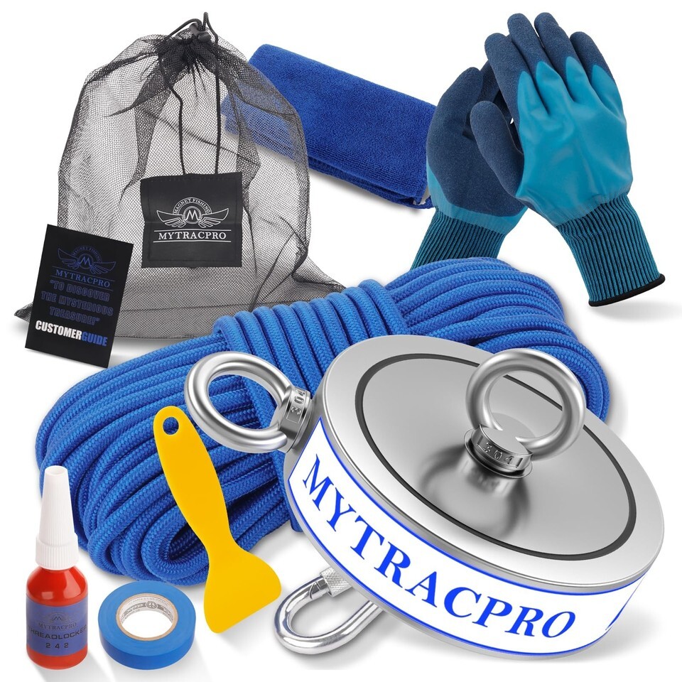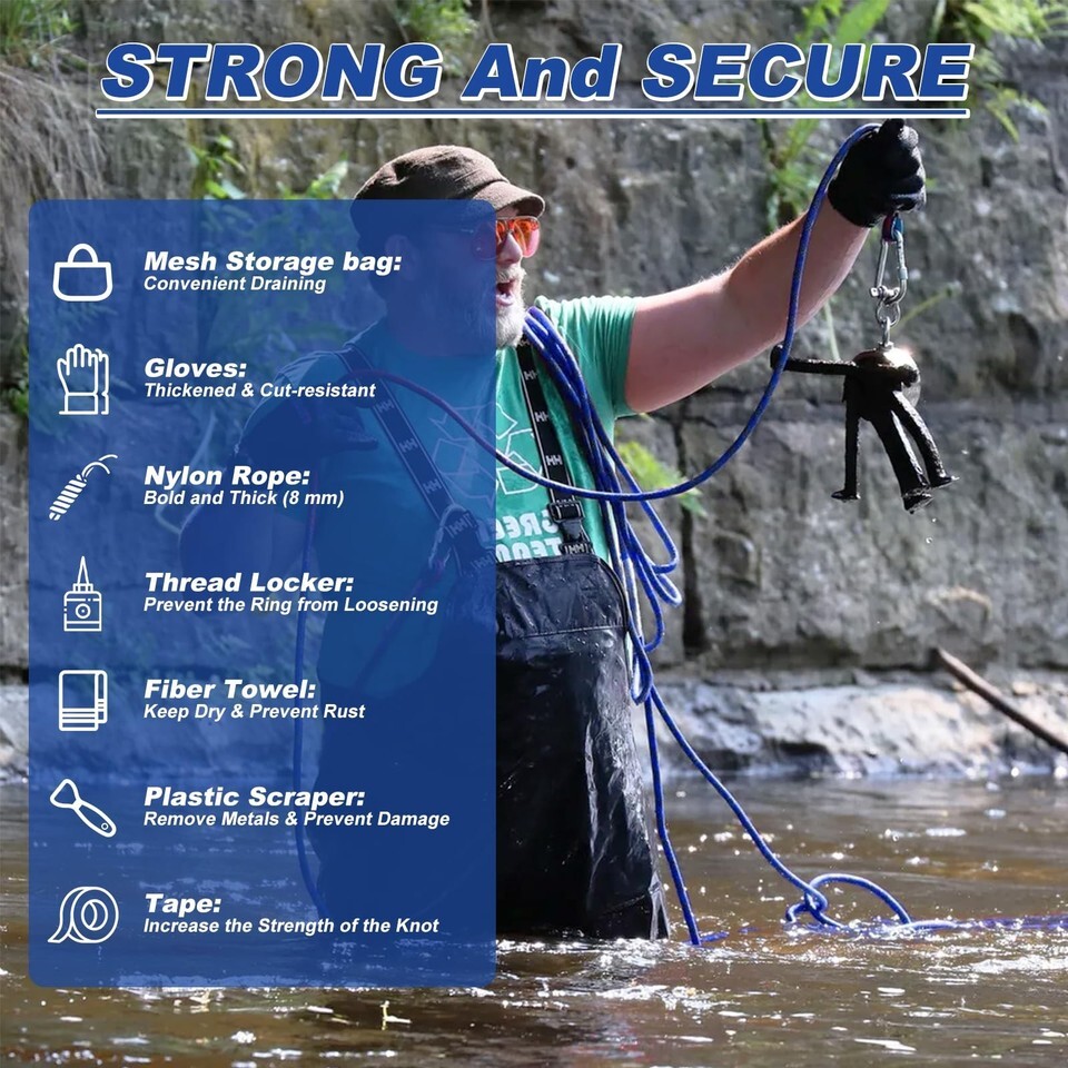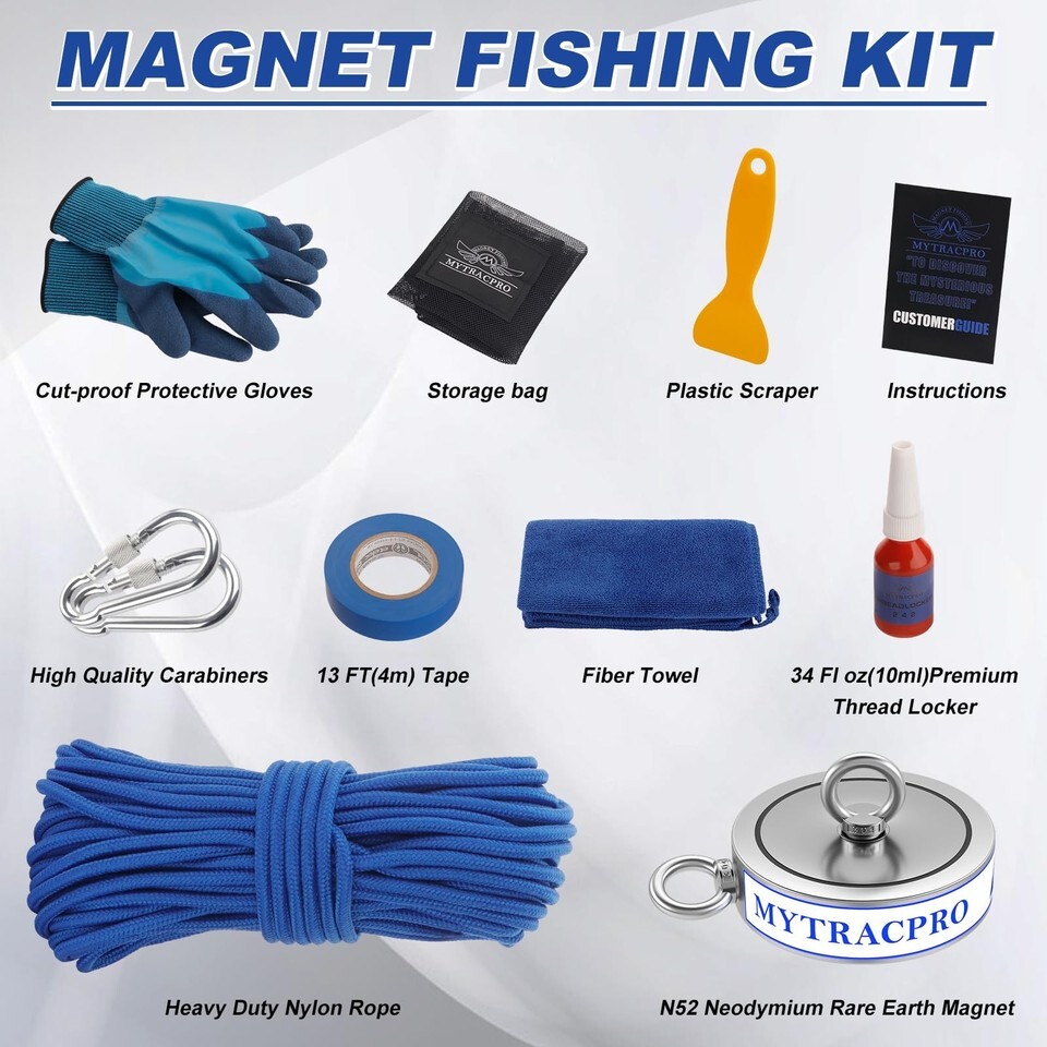 STRONG FISHING MAGNETS KIT: Our Professional Magnet Fishing Kit includes 9 pieces: 1 Double-sided super magnet, 1 sturdy 65 ft nylon rope with strong carabiners, 1 bottle of 242 thread locker, 1 pair of non-slip gloves, 1 plastic scraper, 1 towel, 1 ebook, 1 tape, 1 mesh storage bag. You can easily attract and capture various metal objects using a magnet set, whether fishing, treasure hunting, or underwater salvage.