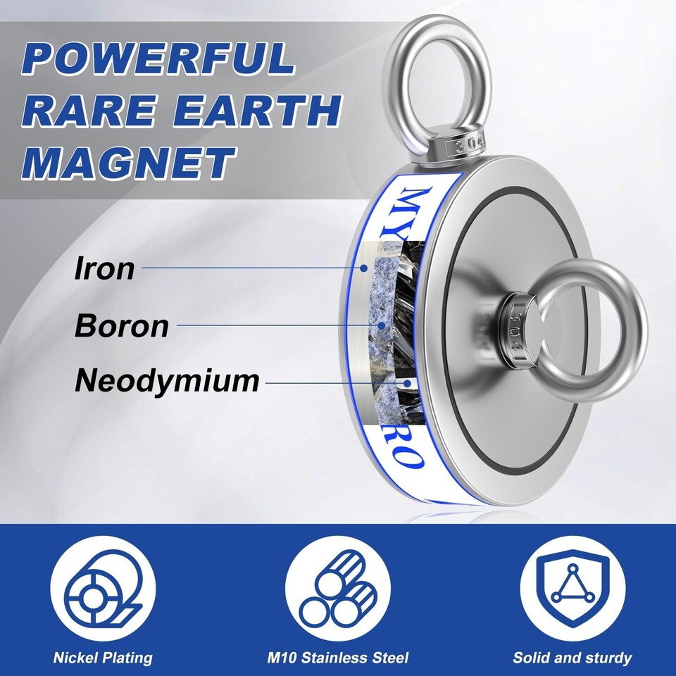 POWERFUL DOUBLE SIDE NEODYMIUM MAGNET: Double-sided pulling force will up to 2600 lbs.Compelling magnetic pulling force for a direct touch and direct pull under ideal conditions.Specifically designed for retrieving in the river and magnetic fishing.Magnet Diameter: 4.5", Thickness: 1.25".