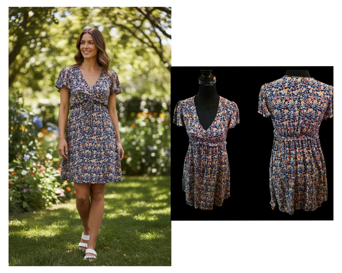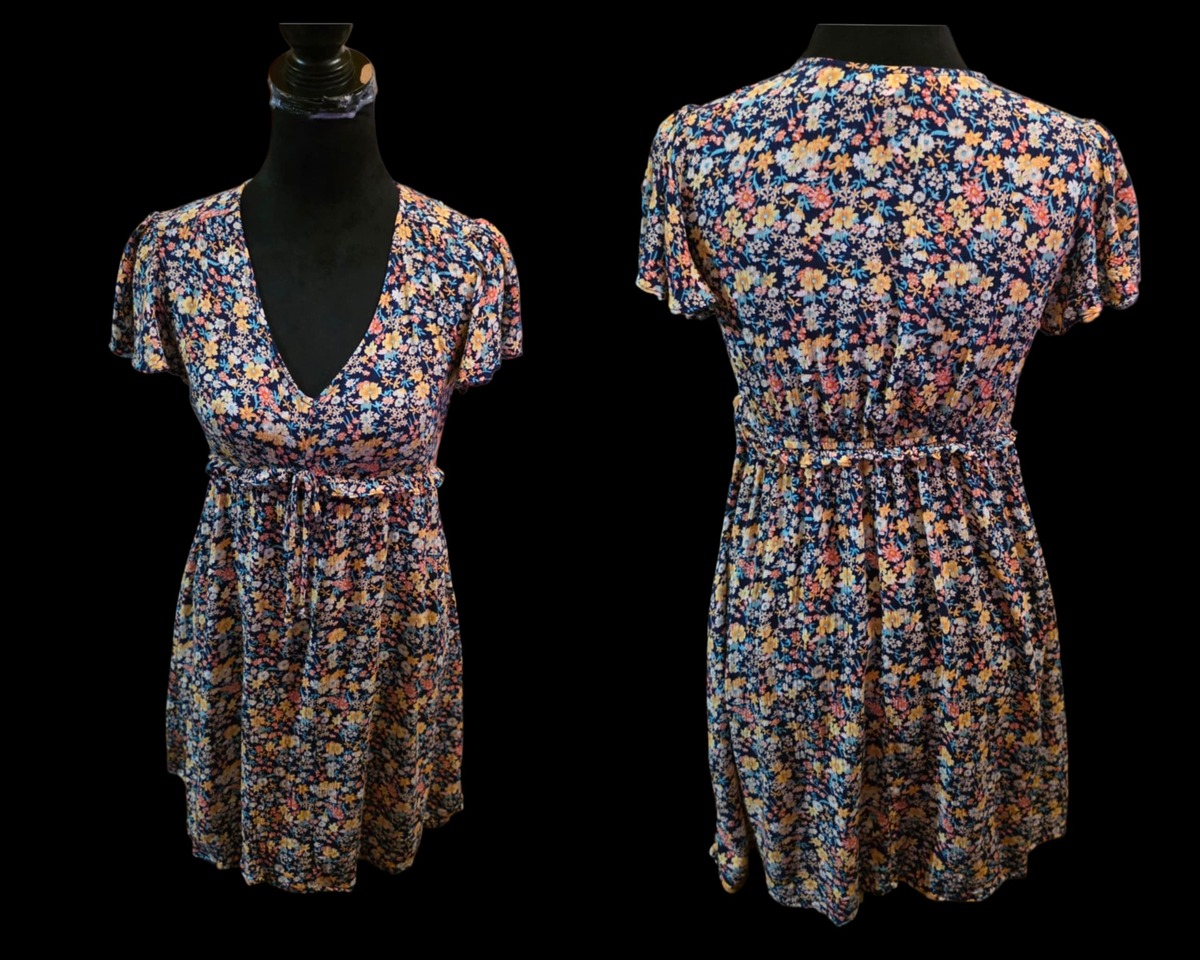 Product Information. features a casual, wrap-style design with a flowing, A-line silhouette. navy blue base with a ditsy (small, scattered) floral pattern in various colors, including pink, yellow, and orange tones. deep V-neck, short sleeves, a defined waist with gathering or a tie, and a mini length. made from lightweight, soft, and breathable fabrics such as rayon, viscose, or polyester, making them suitable for warm weather. Size XS