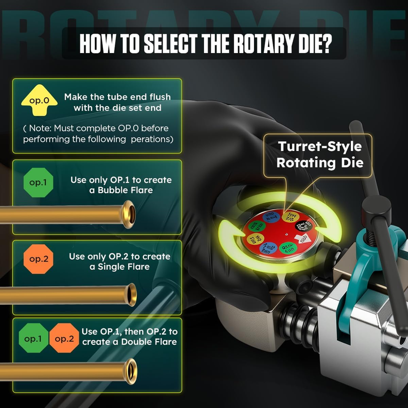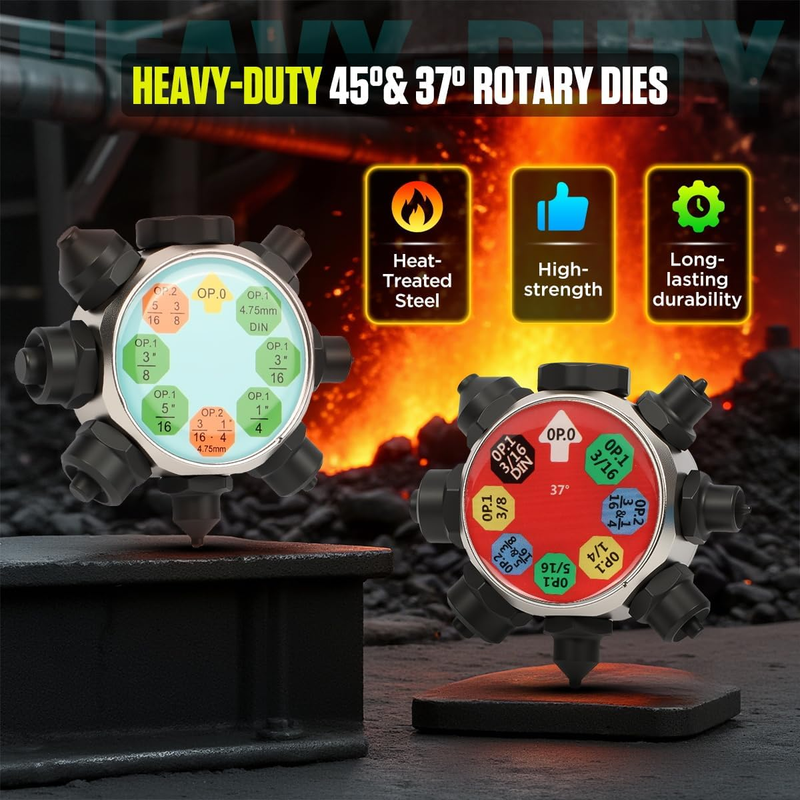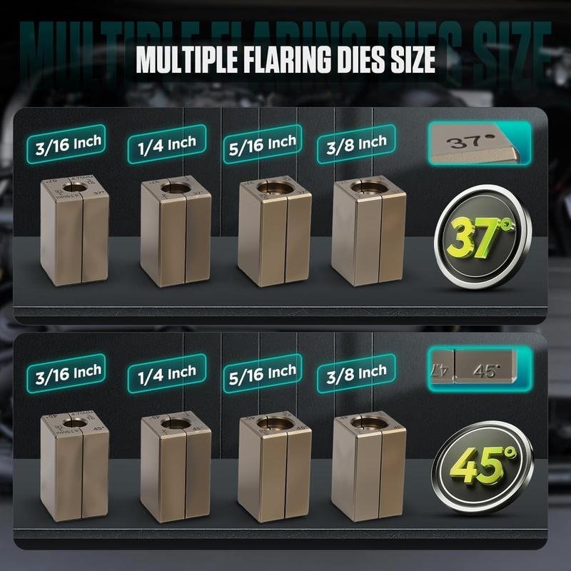 ?Wide Application? - This brake flaring tool set includes 8 dies, designed for tubing diameters of 3/16", 1/4", 5/16", 3/8", and 4.75mm. It is widely suitable for soft metal tubes including copper and aluminum, and can also handle 304 stainless steel and steel tubing, making it a must-have flaring tool for both DIY enthusiasts and mechanics.