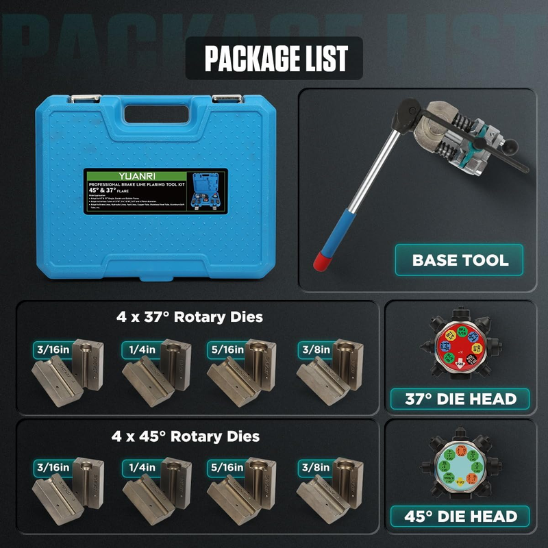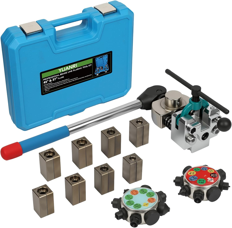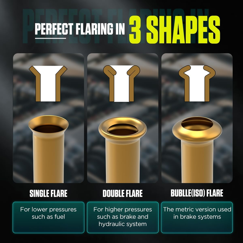 ?37 45 Ultimate Versatility? - Brake Line Flaring Tool Kit featuring dual rotating die heads for both 37 and 45 angles, this flare tool kit effortlessly creates single flares, bubble flares, and double flares. Perfect for brake lines, fuel lines, transmission cooling lines, and more.