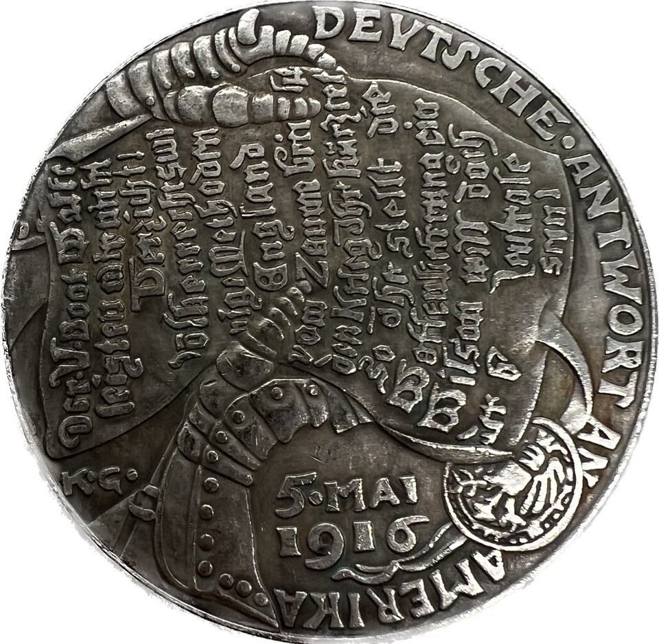 The reverse side of the medal displays Germany's response to America through intricate and artistically engraved text, with May 5, 1916, marking the date of this reaction. The artistic depiction of an armored hand, along with symbolic inscriptions, illustrates Germany's resistance against American demands during the war. This medal serves as a valuable historical artifact, encapsulating the diplomatic tensions and challenges of its time. Perfect for collectors and history enthusiasts alike, it offers a profound glimpse into the complexities of World War I relations.