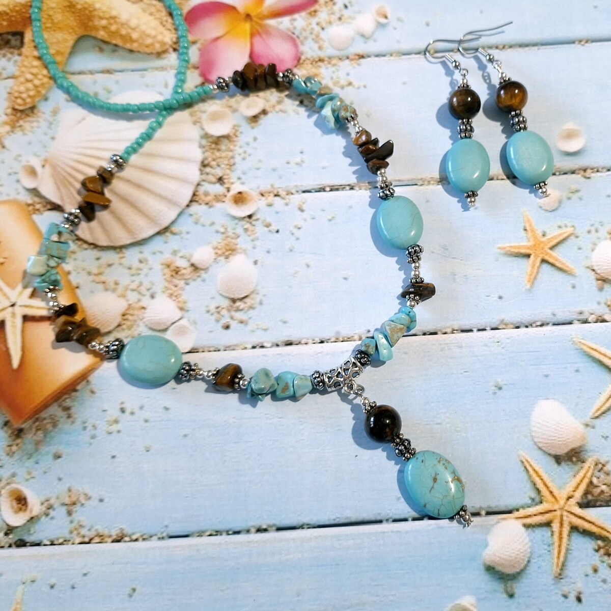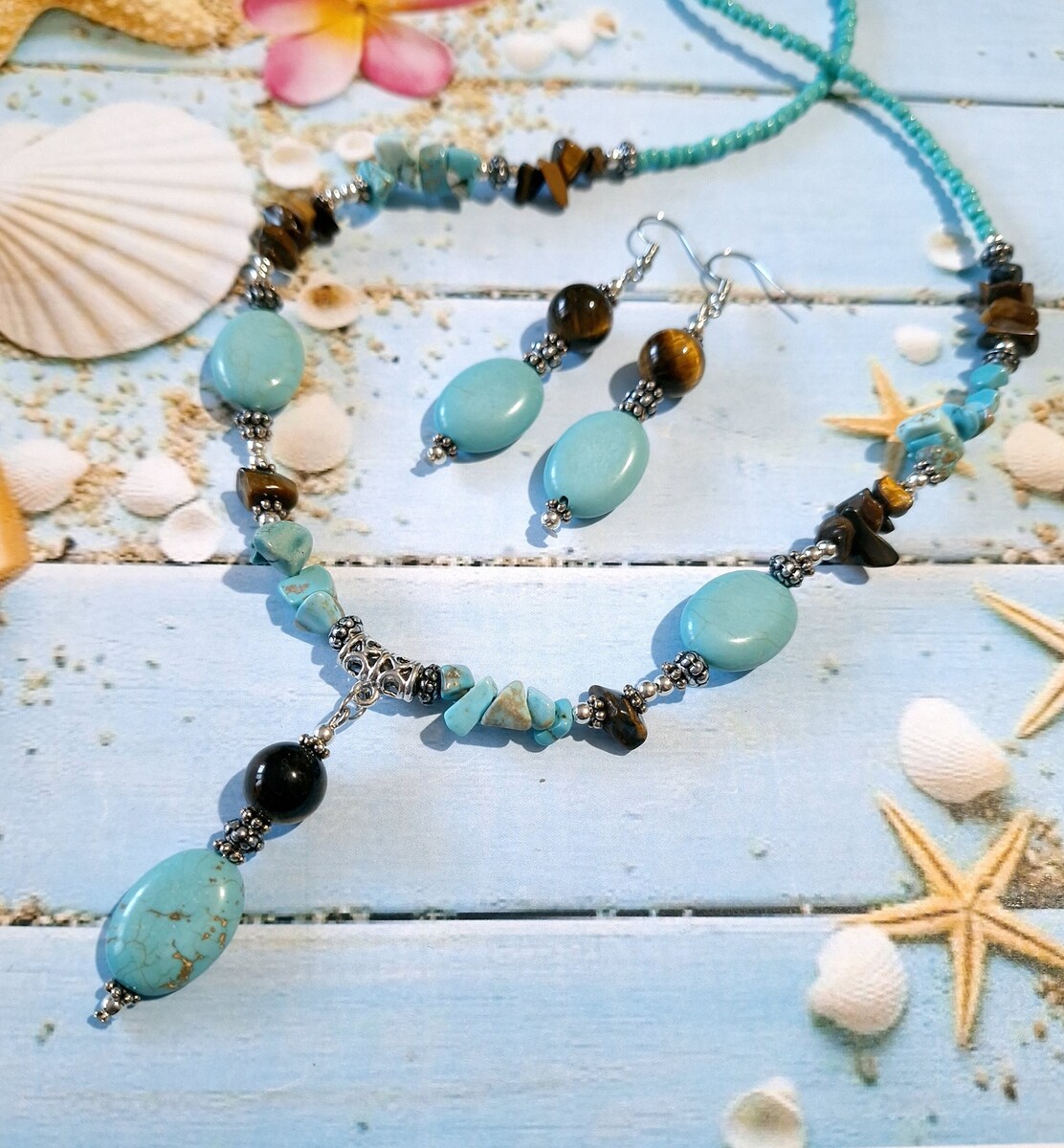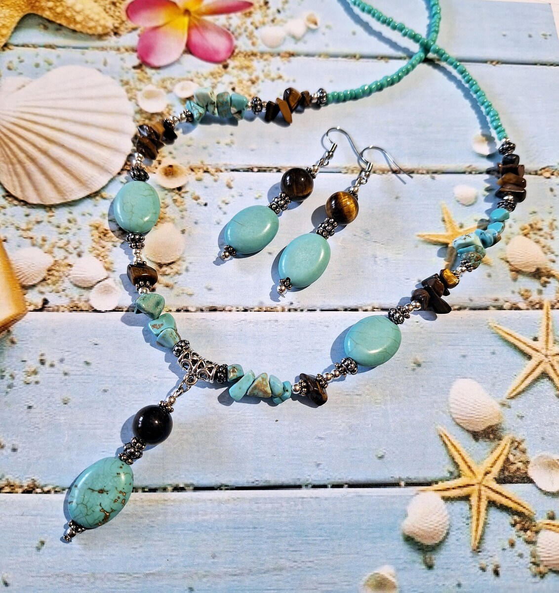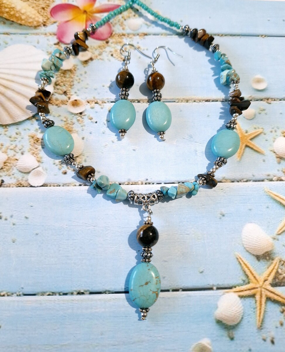 Turquoise and Tiger's eye Victorian set necklace and earrings Bohemian necklace and earrings .