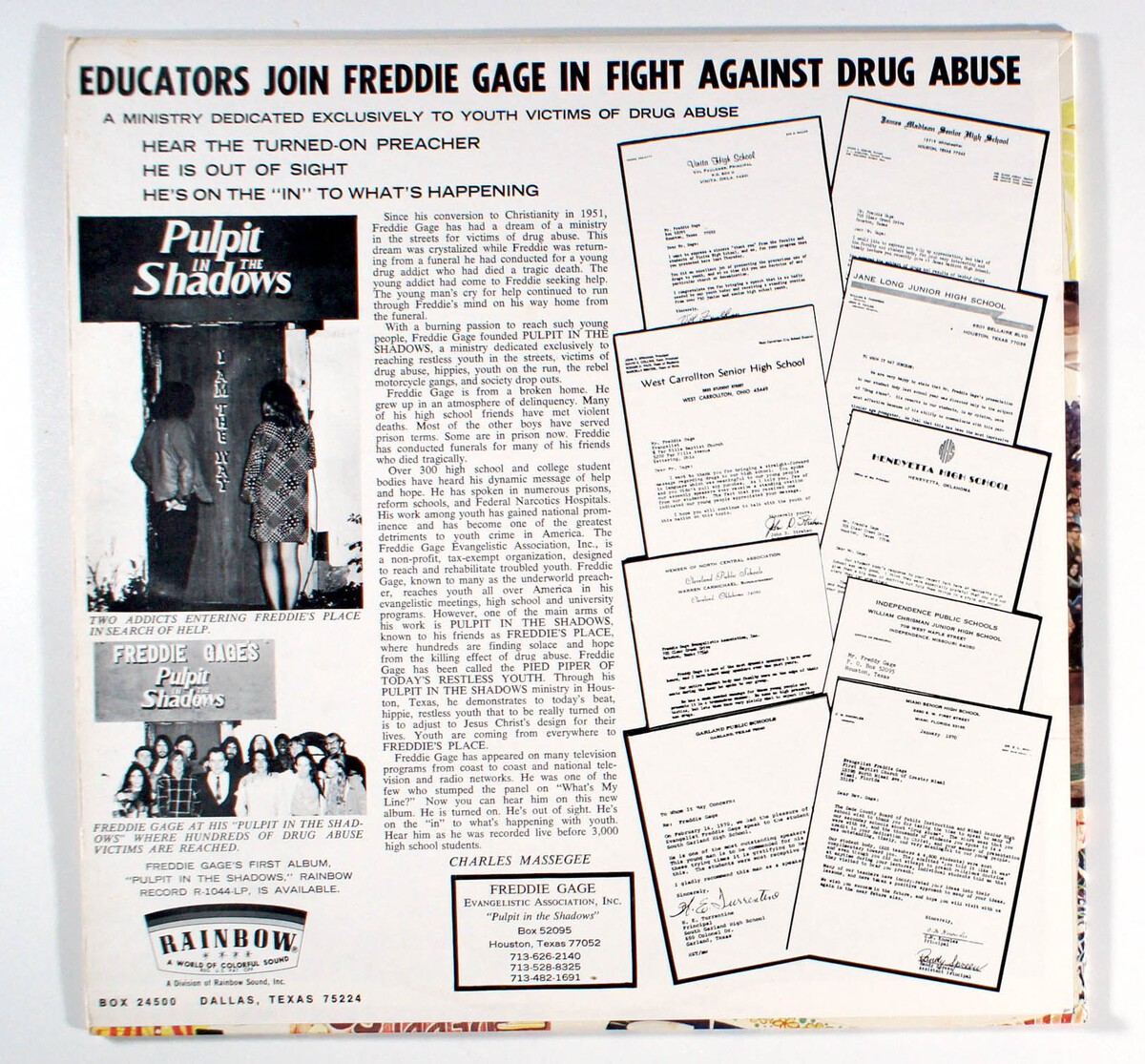 ^Drugs And Youth^ is a 1971 live album by Baptist evangelist Freddie Gage, recorded before an audience of 3,000 high school students in Lafayette, Louisiana. The recording captures Gage's fiery sermon addressing the escalating drug epidemic and its perils for young people amid the counterculture and hippie movements of the late 1960s and early 1970s. Historically significant as a product of Gage's transformation from a teenage gang leader and drug addict in Houston to one of the era's most influential evangelistssecond only to Billy Graham in impact the album reflects his street-smart preaching style that drew massive crowds and reportedly led over a million souls to Christ through his youth-focused ministries. An earlier version titled ^The Drug Epidemic^ was released in 1969, underscoring Gage's ongoing crusade against substance abuse during a time of national crisis. As a non-music spoken-word release, it produced no hit singles, though tracks like the full sermon sides have gained cult status among collectors of obscure religious vinyl.