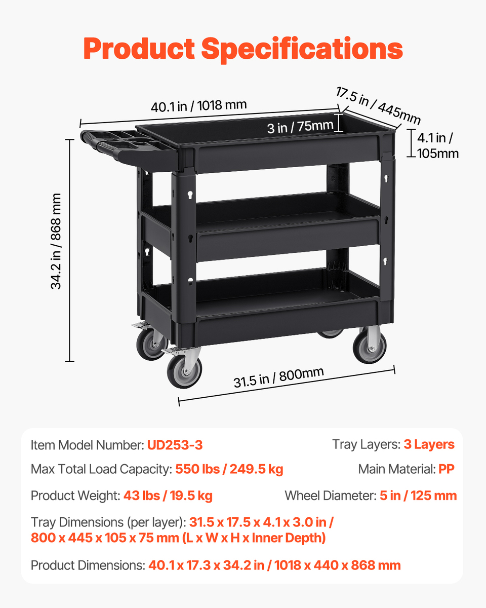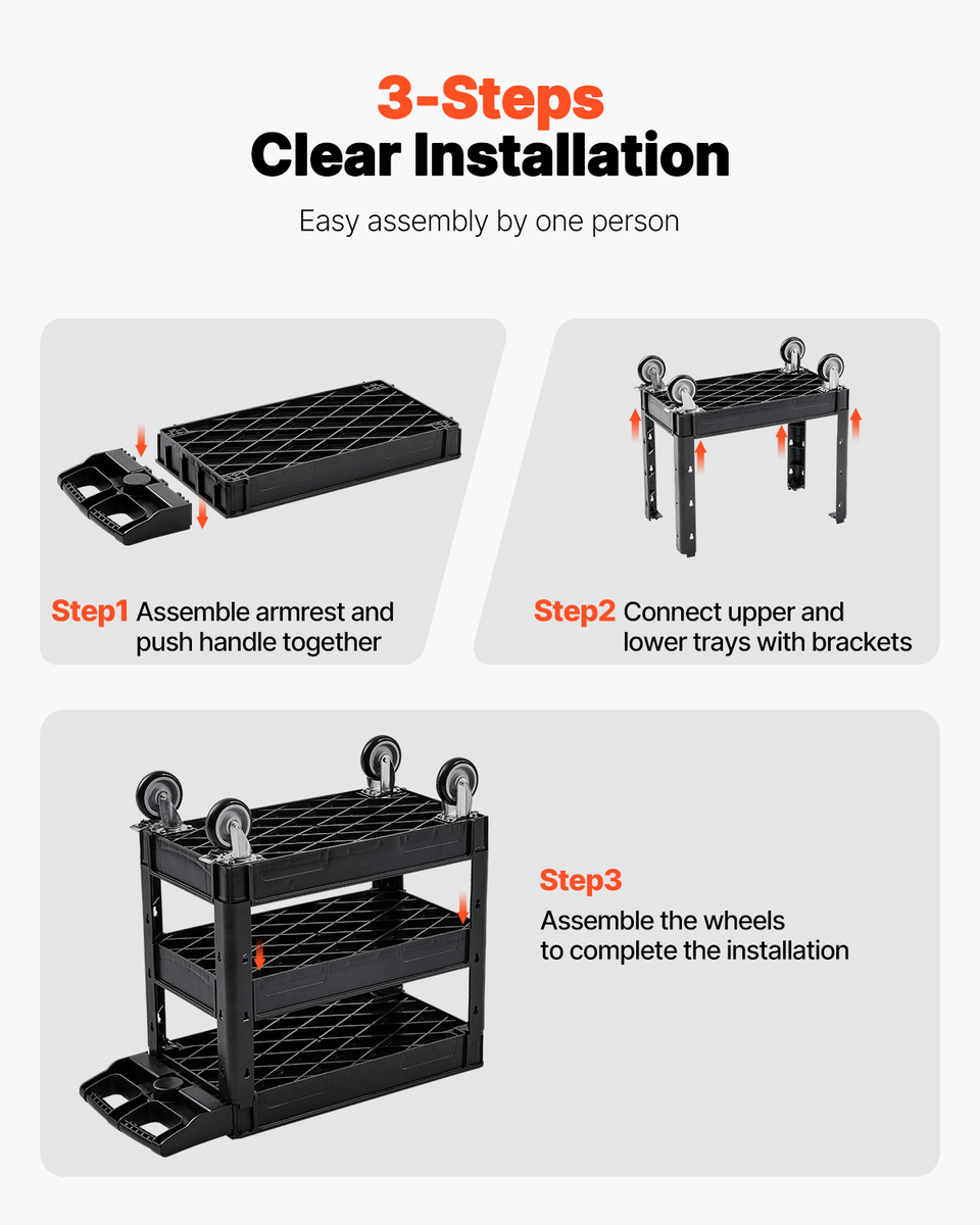 Easy Installation: This rolling utility cart can be assembled in just 3 simple steps. It comes with detailed instructions, and assembly can be done easily in minutes. Upper Tray Size: 31.50 x 17.13 x 4.13 in ; Medium Lower Tray Size: 31.22 x 17.13 x 4.13 in ; Each Shelf Load Capacity: 183 lbs ; Maximum Load Capacity: 550 lbs.