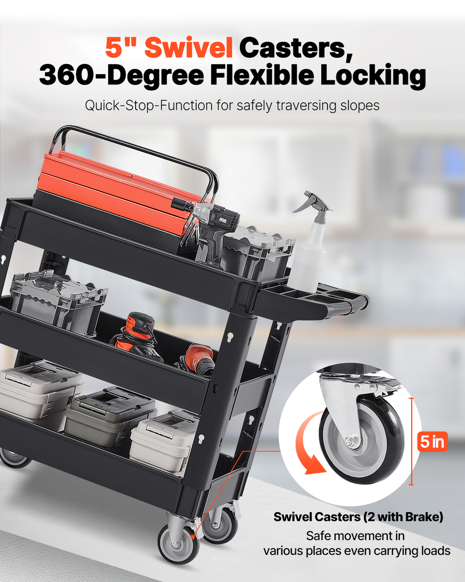 VEVOR Utility Service Cart, 3 Shelf 550 LBS, 360° Swivel Wheels (2 with Brakes)