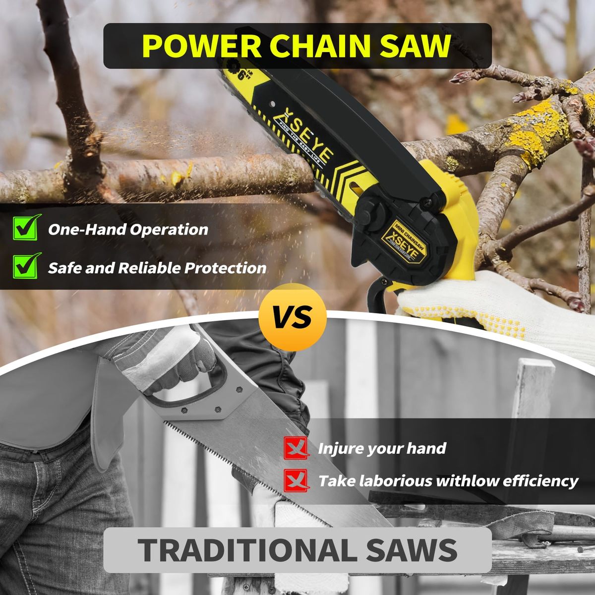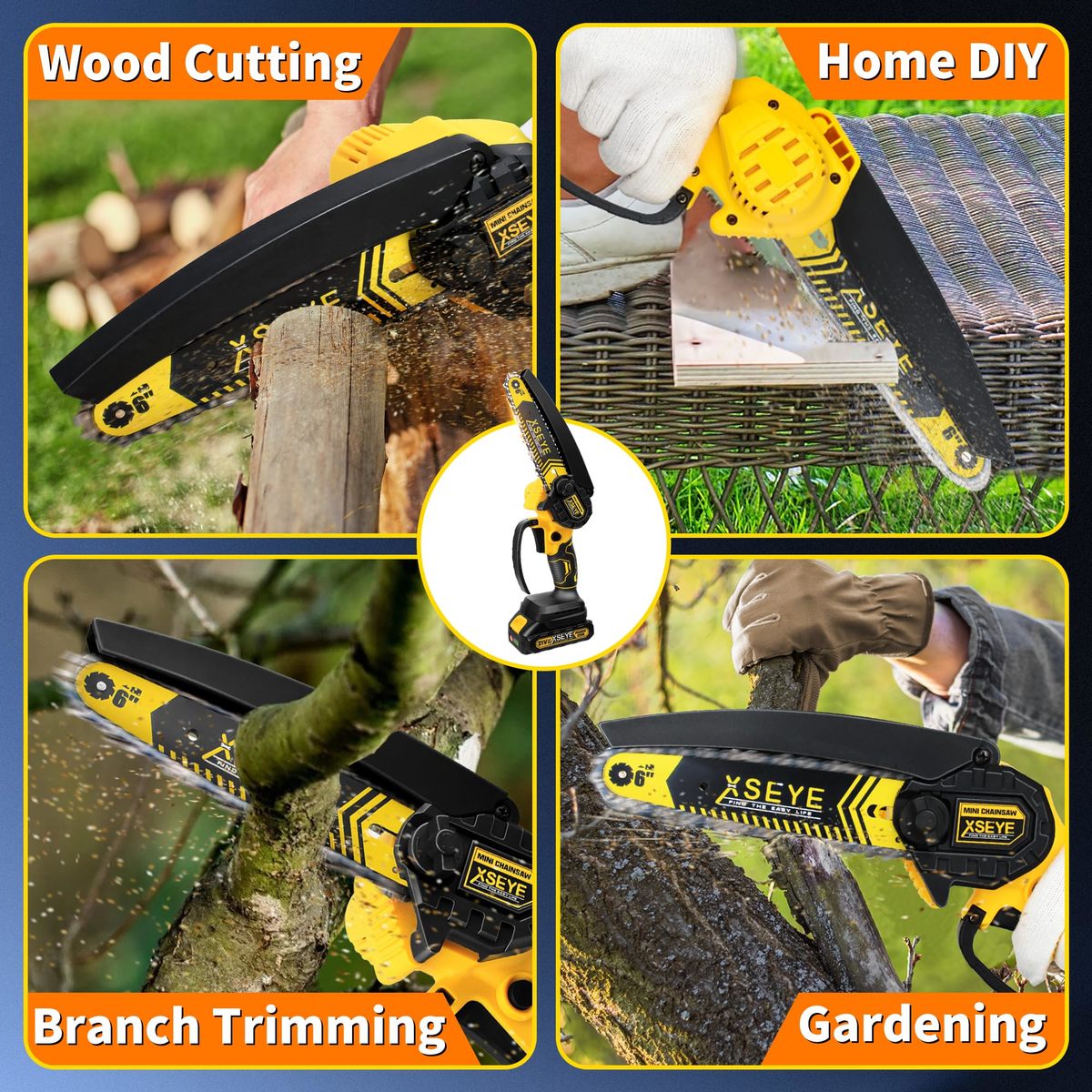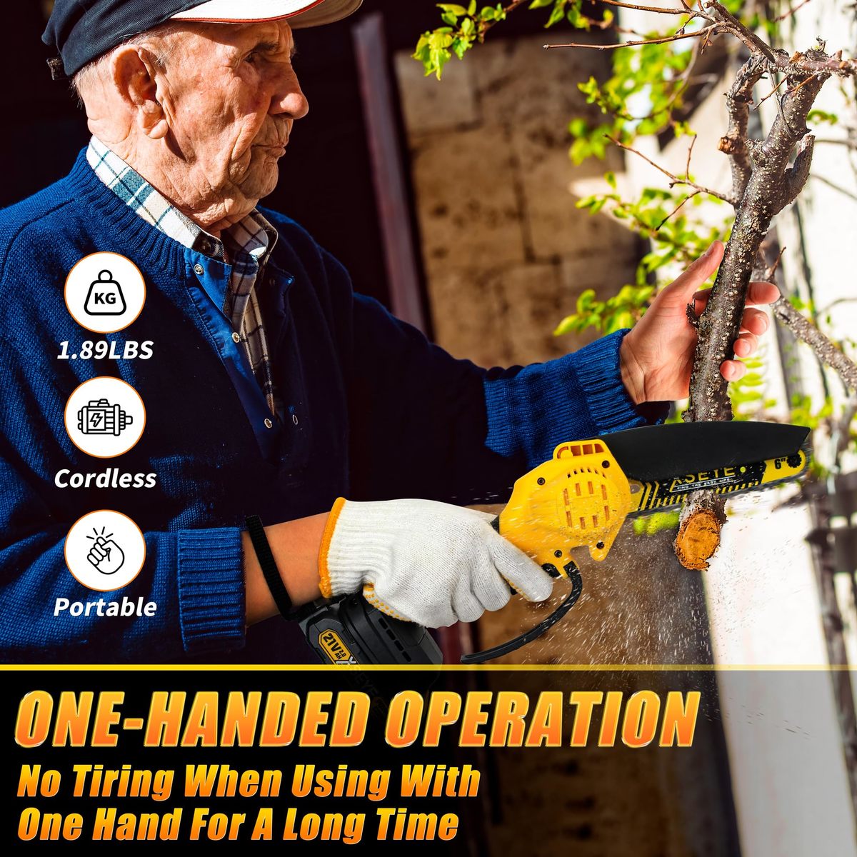 ?ONE HAND USE CHAINSAW?The Lightweight Mini Cordless Chainsaw weighs just 2.63 pounds and features an ergonomically designed handle for comfortable, fatigue-free one-handed use. It?s easy to maneuver and a joy to work with, making it ideal for beginners and gardeners alike. The cordless design ensures excellent portability, even in tight spaces.