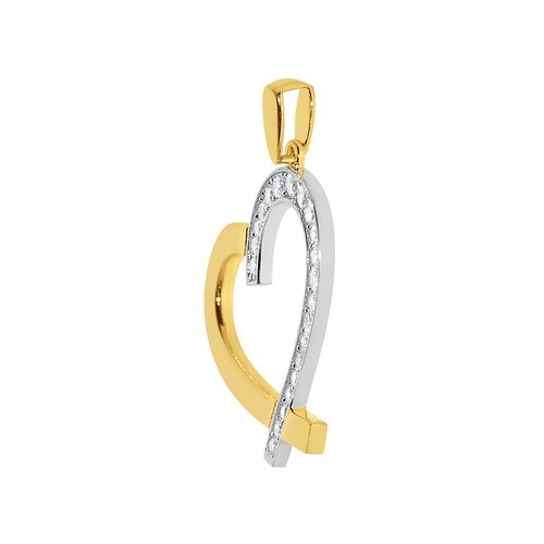 This exquisite heart-shaped pendant dazzles with an array of sparkling cubic zirconia, seamlessly blending round and baguette cuts. Crafted from lustrous 14-karat yellow gold, it showcases its intoxicating brilliance in a delicate frame measuring 24mm long and 22 mm wide. This pendant embodies both lightness and elegance, making it a perfect accessory for any occasion.