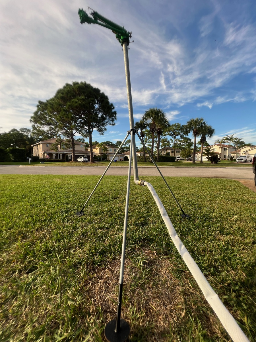 Note: Our High Performance Pump Package (See other listings) with 100 feet of fire hose is being used in the pictures above with a size 14 gpm plastic nozzle (that's included) in the water cannon. The tripod was in the all the way down position (so it didn't shoot water over the house) in this video and it was throwing pool water approximately 90 feet in this picture.