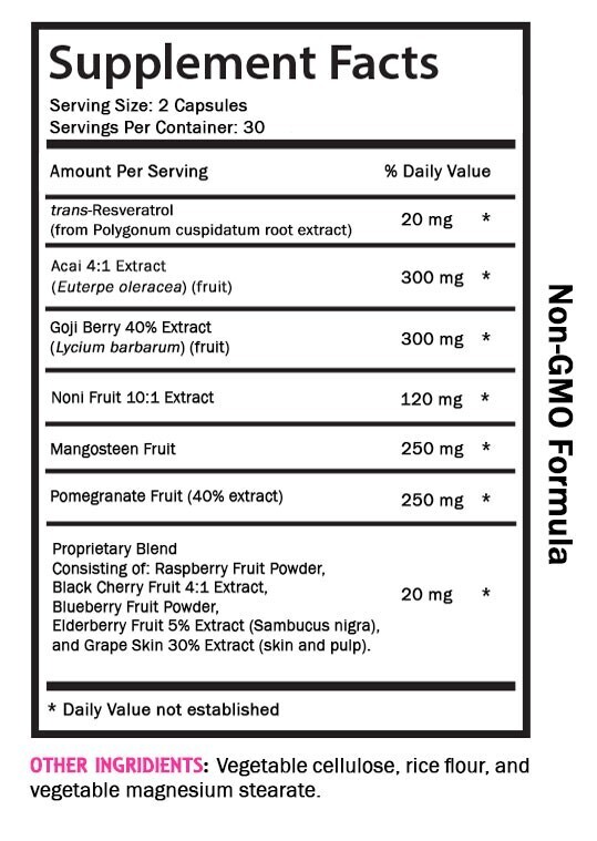 RESVERATROL COMLEX: Our powerful dietary supplement designed to support a balanced internal environment and promote optimal well-being. This advanced formula combines the natural benefits of Trans-Resveratrol, Acai 4:1 Extract, Gojl Berry 40% Extract, Noni Fruit 10:1 Extract, Mangosteen Fruit, Pomegranate Fruit (40% extract), Raspberry Fruit Powder, Black Cherry Fruit 4:1 Extract, Blueberry Fruit Powder, Elderberry Fruit 5% Extract (Sambucus nigra), and Grape Skin 30% Extract (skin and pulp) with a blend of potent ingredients known for their properties.