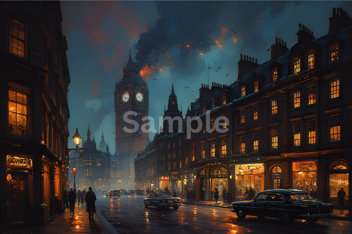 A breathtaking scene of London captured in a rare moment of surreal drama and cinematic beauty. The warm glow of the city’s lights reflects across the quiet streets as the iconic clock tower blazes with fiery brilliance against the deep night sky. Smoke curls upward like a dark crown, contrasting with the calm atmosphere below. This image blends elegance, tension, and urban charm—perfect for collectors, storytellers, or anyone who loves artwork that captures both the spirit of London and the thrill of a once-in-a-lifetime moment.