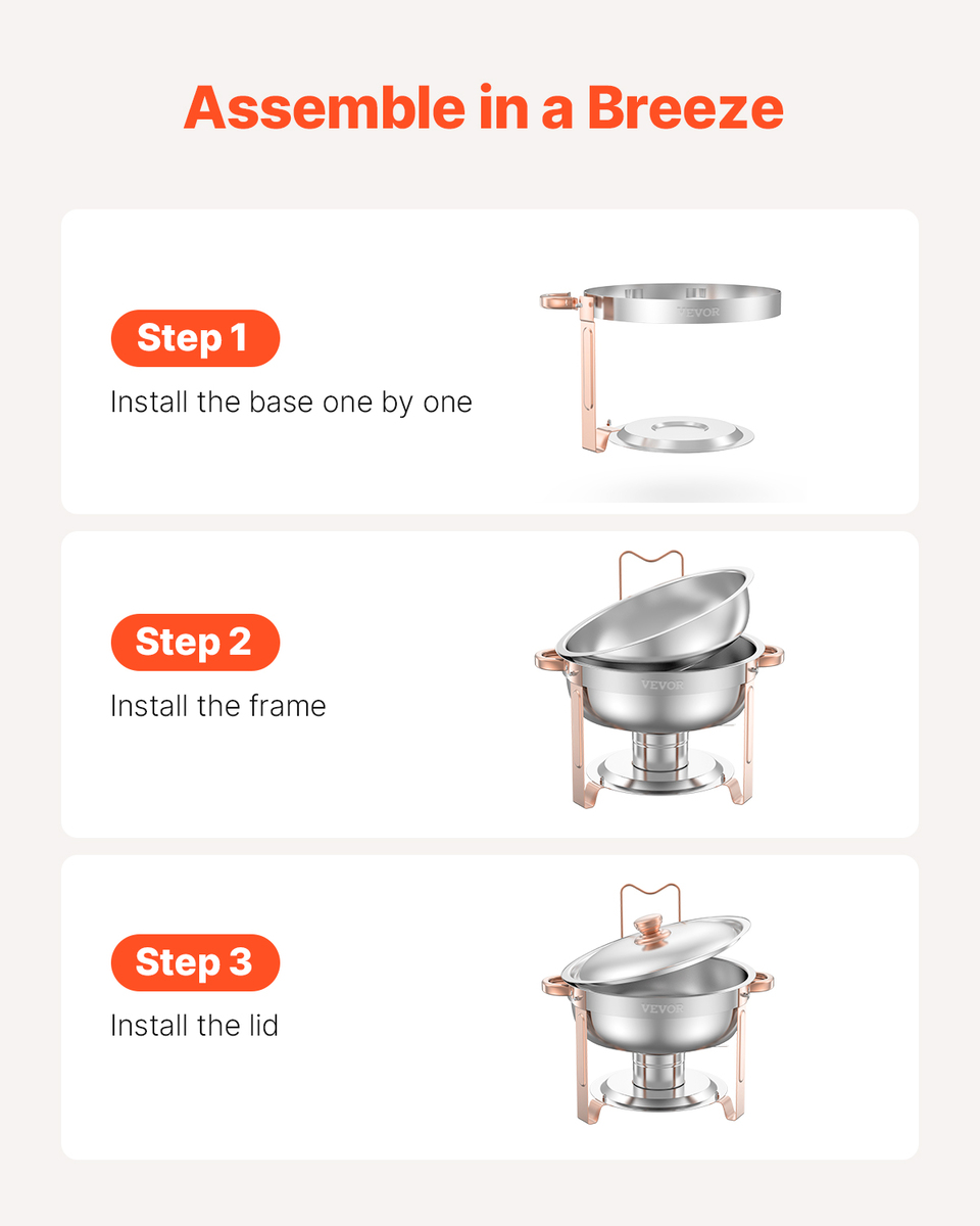 Space-Saving Design: This chafer set features an easy-to-assemble, folding design that saves valuable storage space. Its compact nature ensures that it can be conveniently stored without taking up much room
