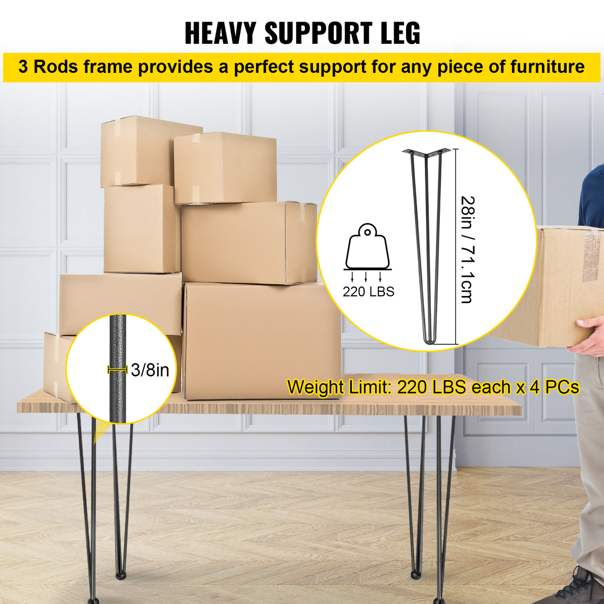 Durable Steel in Powder Coating: Our hairpin desk legs adopt three 3/8'' steel rods, making them more stable and stronger than 2 rods. Each leg can support max. 220 lbs/ 100 kg load without deformation (4 set legs up to 880 lbs loading). Finished with powder coating technology, the legs are glossy, rust-proof, and smooth to the touch. Stability and a clean appearance to stand up to anything.
