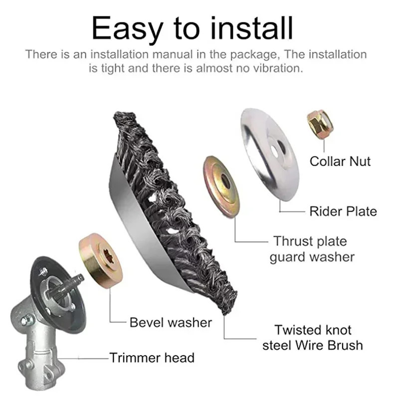 The weed brush is made of carbon steel wire, which can operate normally when hitting stones and hard blocks. Its service life will be 10 times longer than that of other trimmer heads.