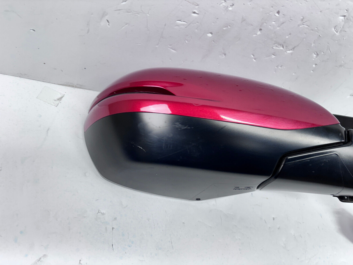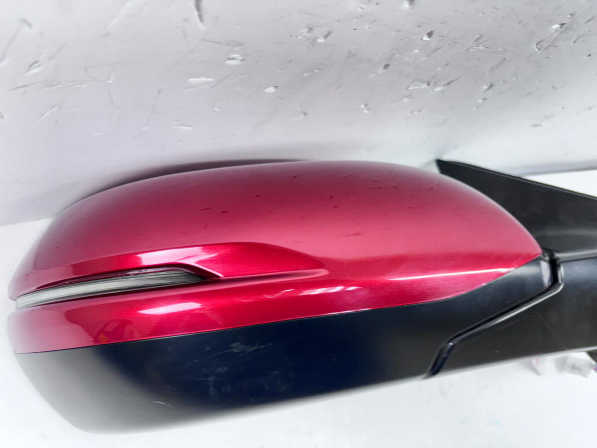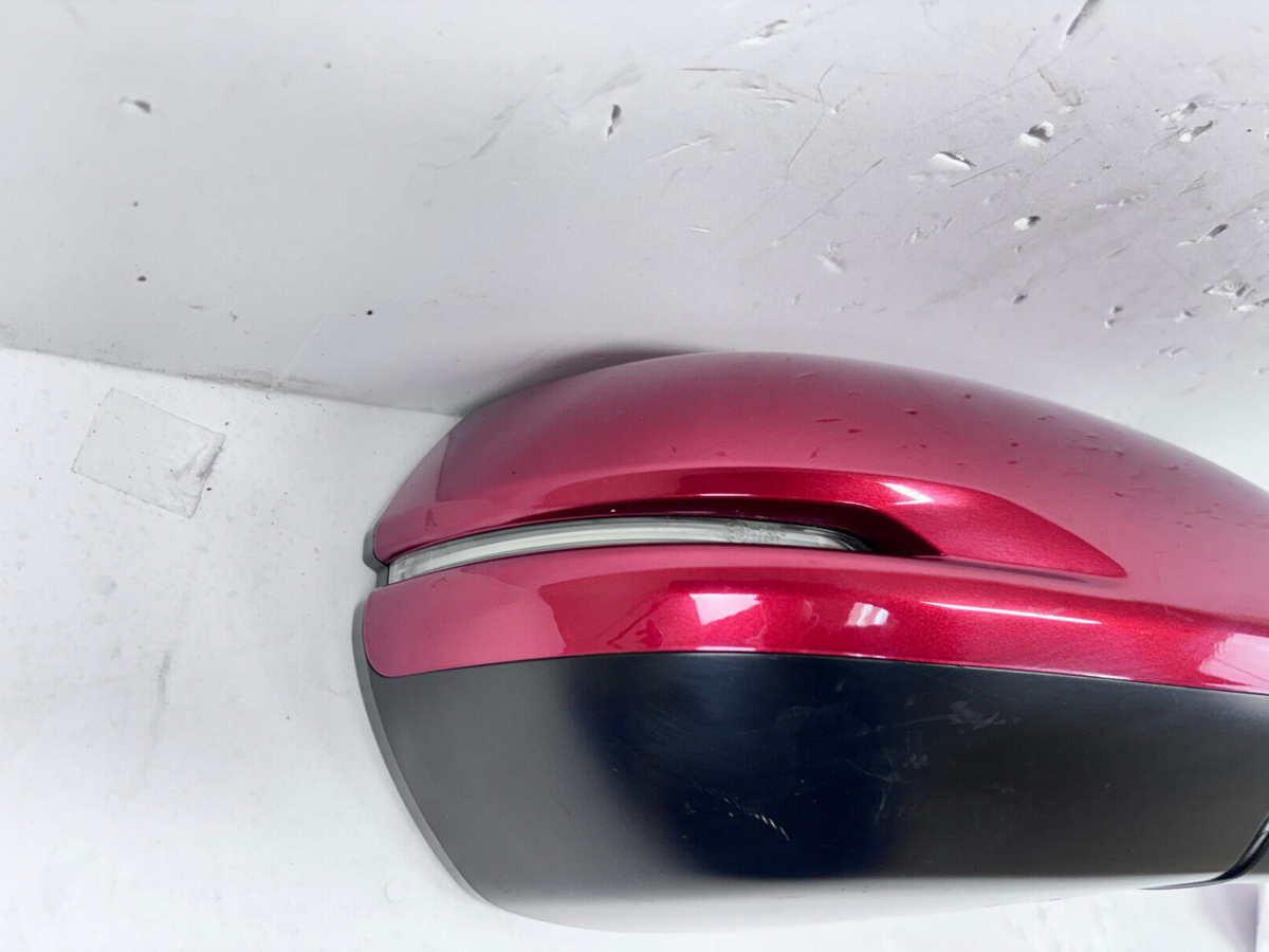 Used OEM Honda CR-V Blind Spot Front Right Mirror with integrated turn signal. Fits 2017 through 2022 Honda CR-V models. Red painted finish with a 9-pin connector. This is a standard mirror assembly featuring blind spot indication and a built in turn signal.