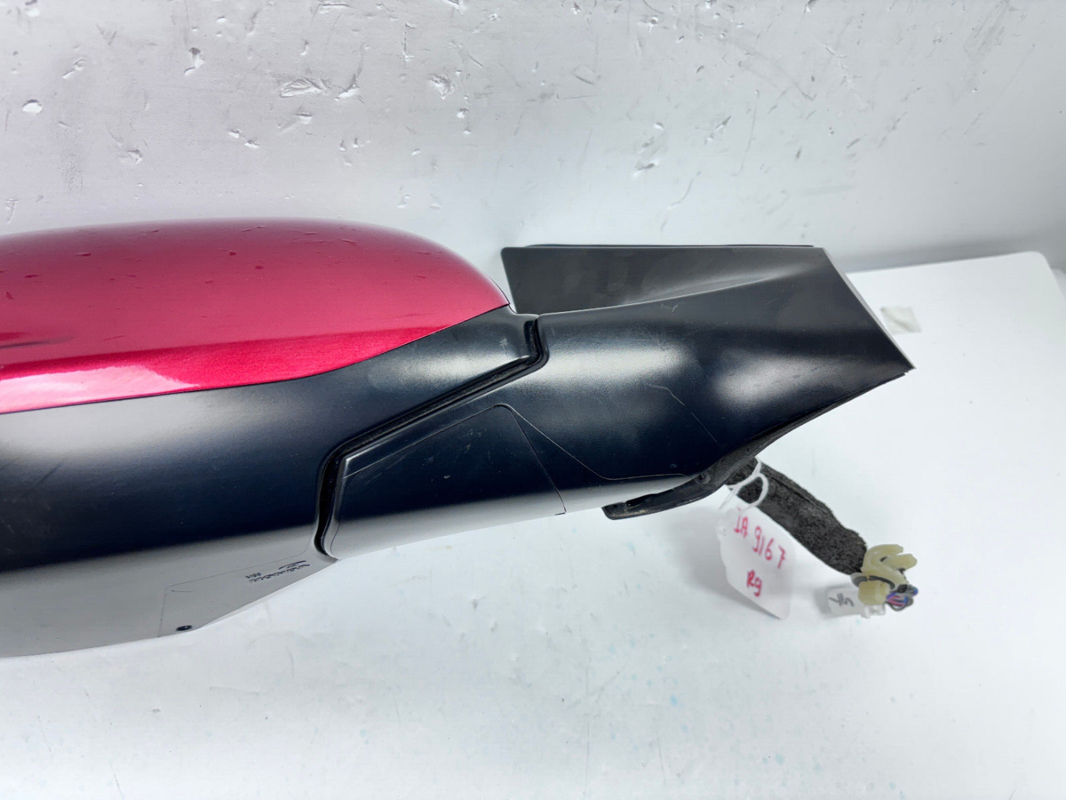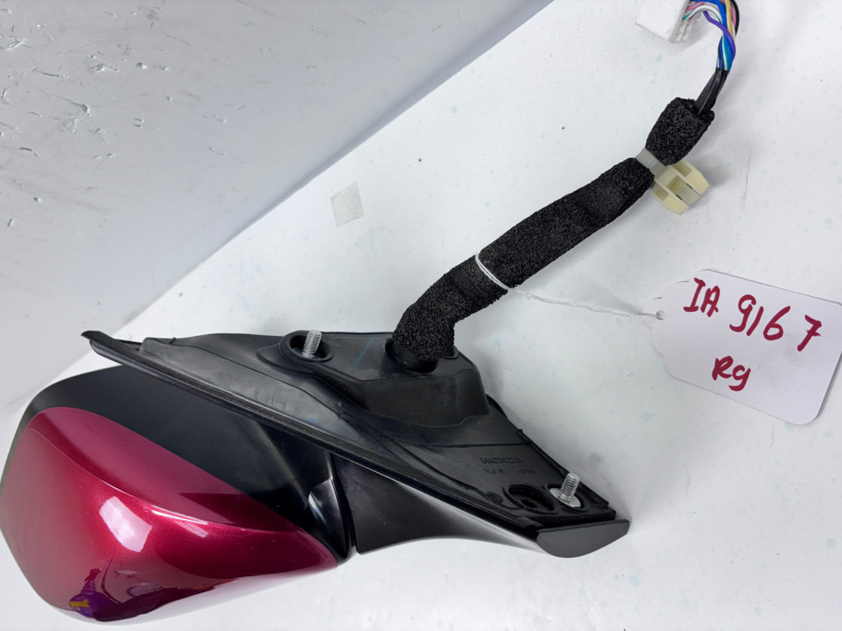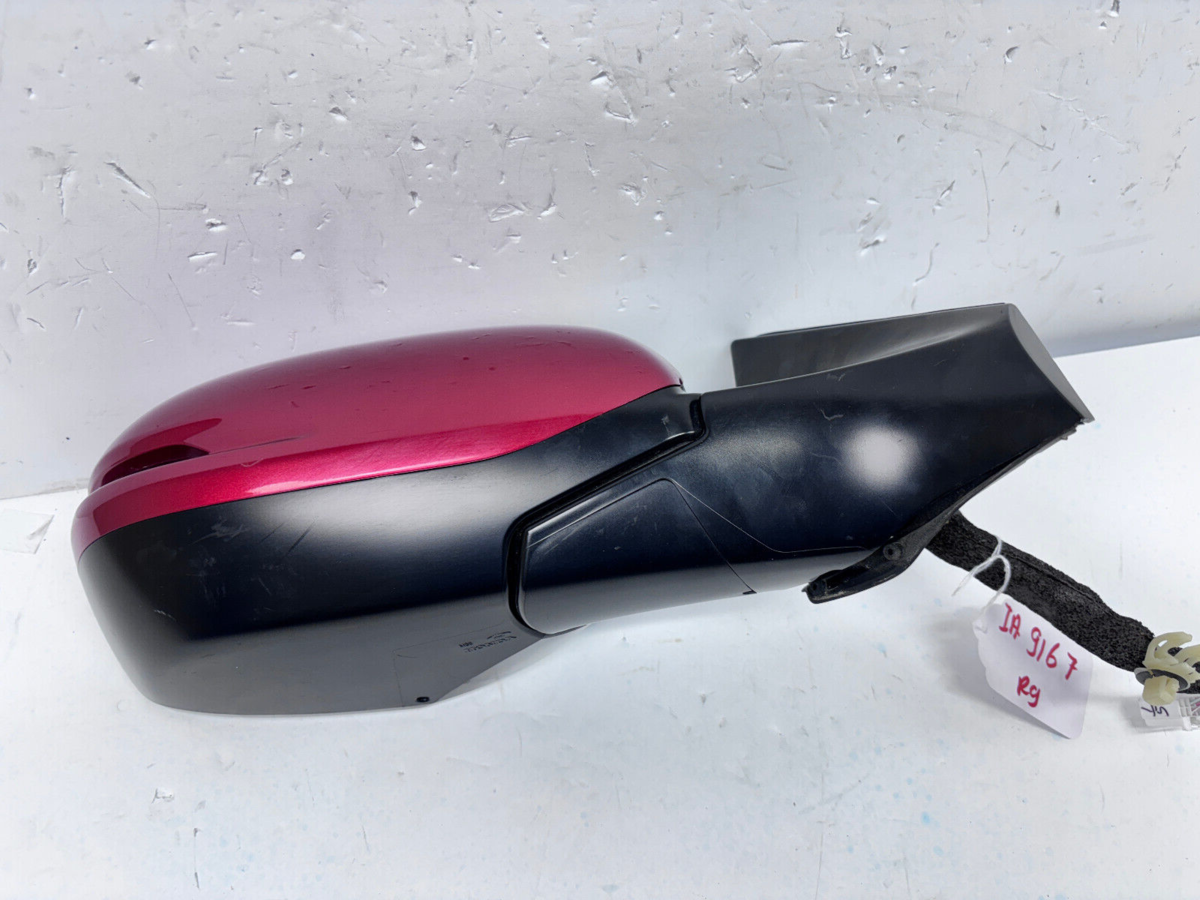 Used OEM Honda CR-V Blind Spot Front Right Mirror with integrated turn signal. Fits 2017 through 2022 Honda CR-V models. Red painted finish with a 9-pin connector. This is a standard mirror assembly featuring blind spot indication and a built in turn signal.