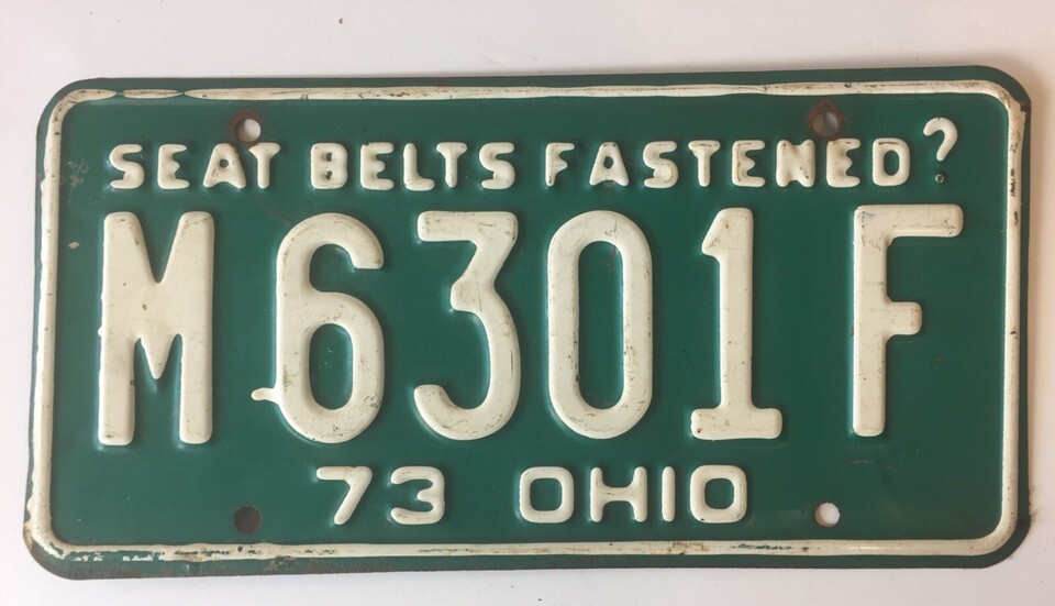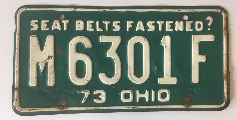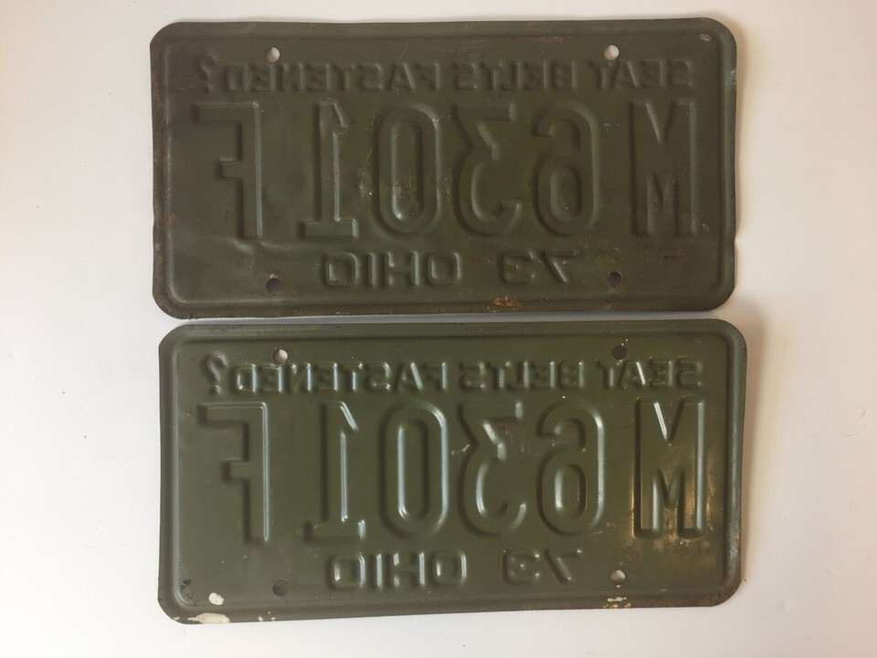 Pair of 1973 Ohio License Plate OH 73 Seat Belts Fastened?