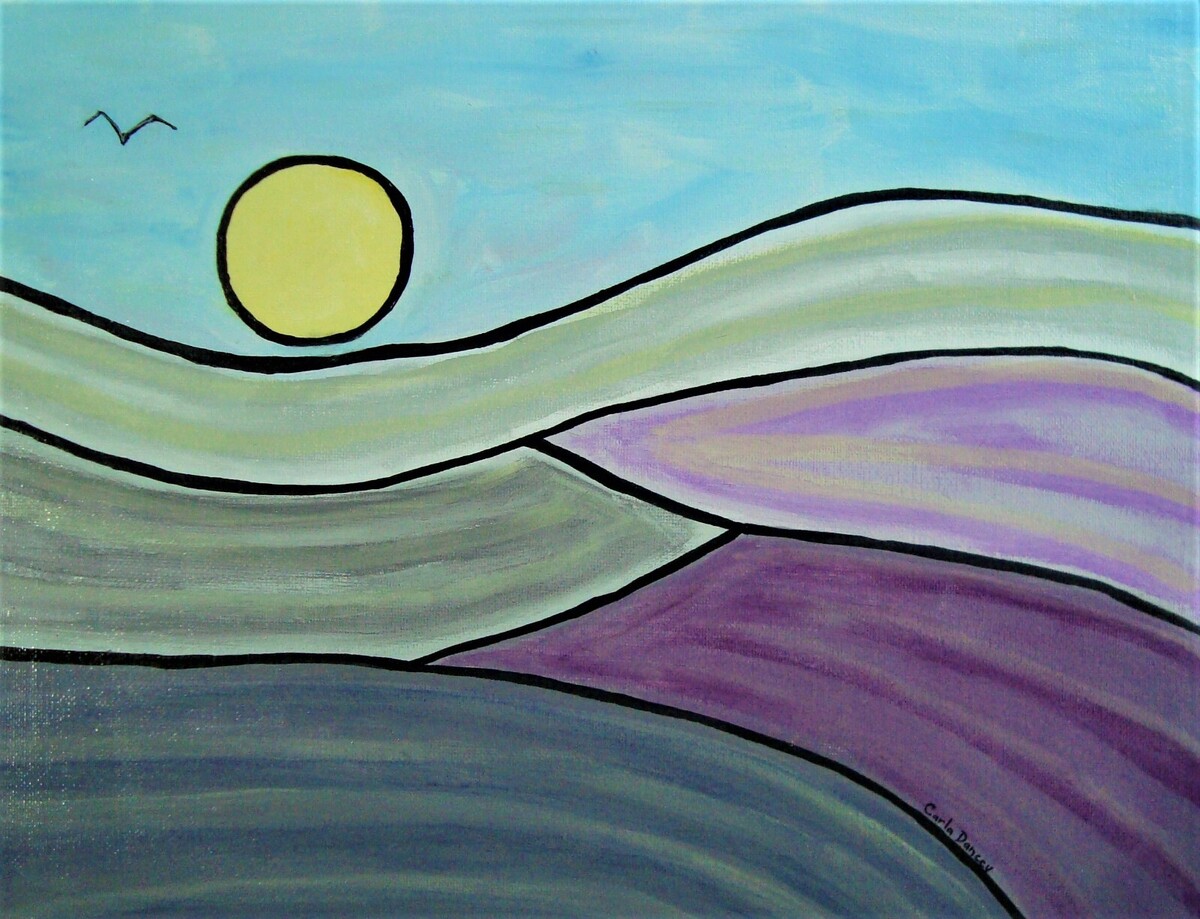 This one-of-a-kind landscape painting titled "Landscape" by Canadian artist Carla Dancey is a stunning addition to any art collection. Painted on a canvas board with acrylic, the piece measures 14 x 11 inches and features a beautiful representation of crops fields in the style of Vincent Van Gogh and the Group of Seven. The lavender fields and wheat/barley crops are depicted with a geometric flair, creating a peaceful and serene atmosphere.