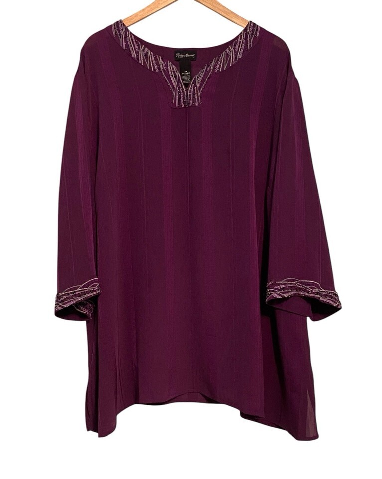 Maggie Barnes Tunic Purple Beaded Sheer Blouse Plus Size Sz 3X Vintage Dressy