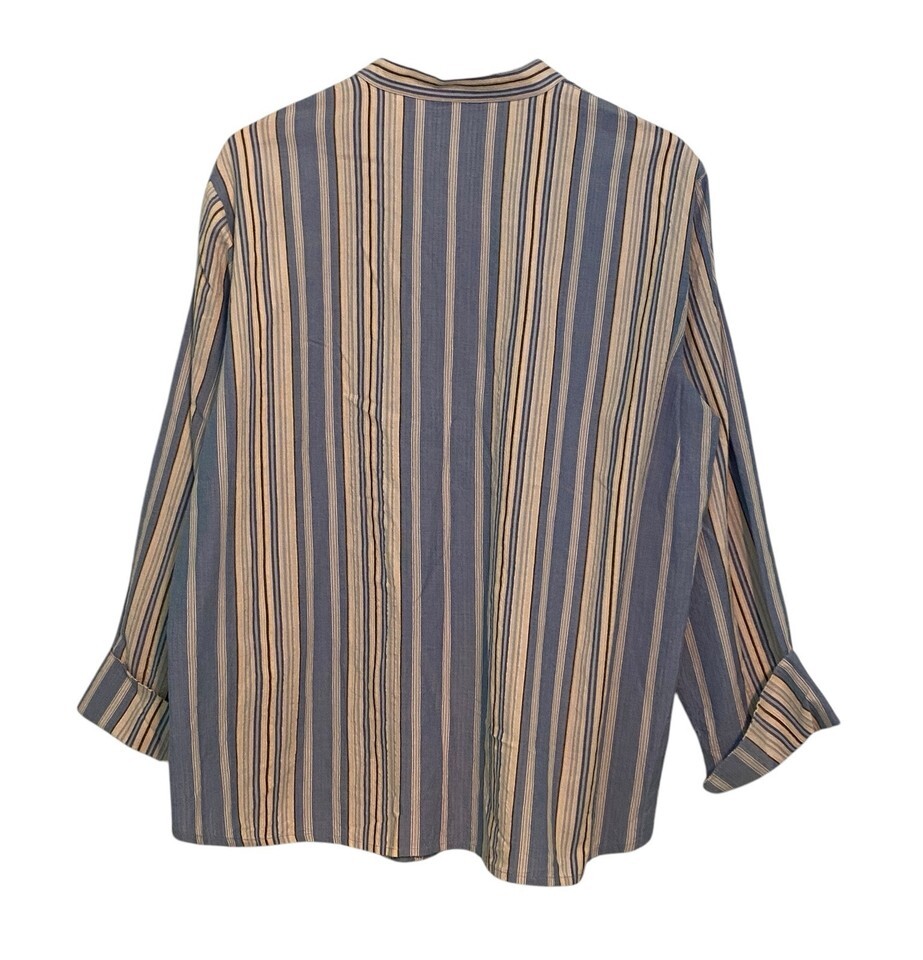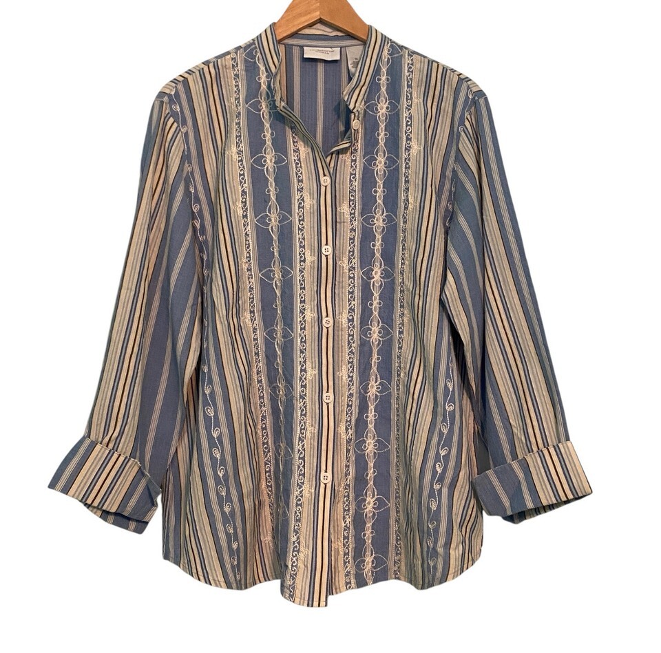 This is a vintage Liz Claiborne blouse in size 1X with embroidery on blue cream stripes. Made of viscose and cotton chambray fabric, the button-up blouse features long sleeves, a stand-up collar, and is machine washable. It has a classic style suitable for travel, casual, or business occasions, and is handmade in India.