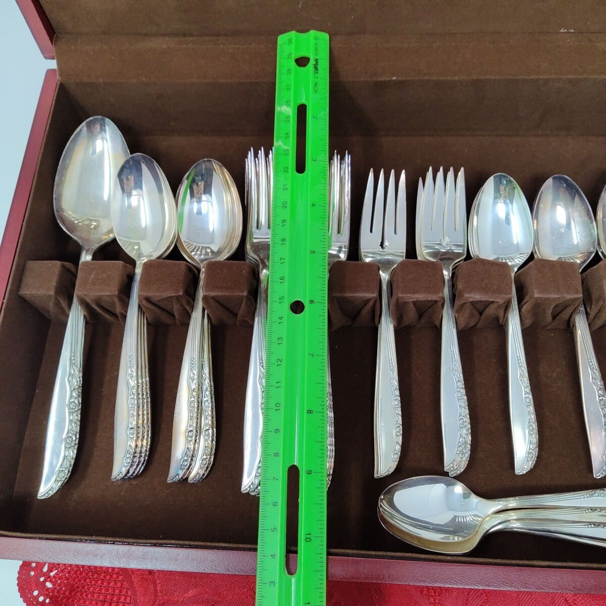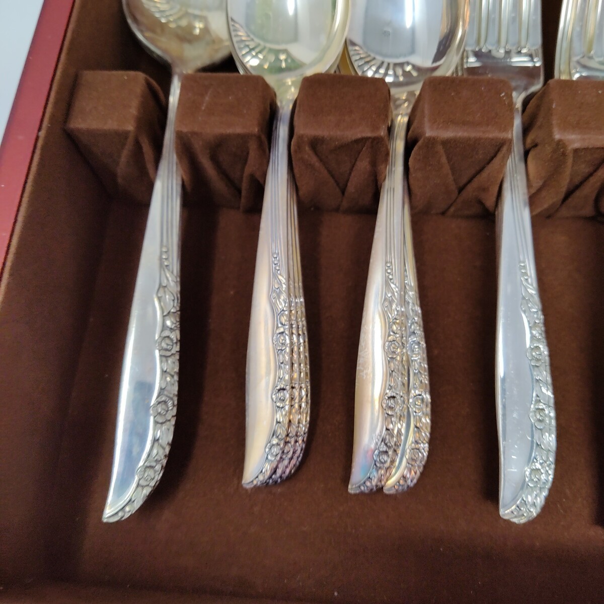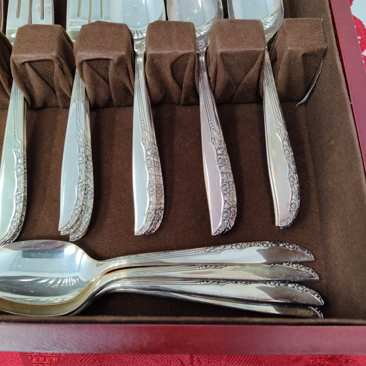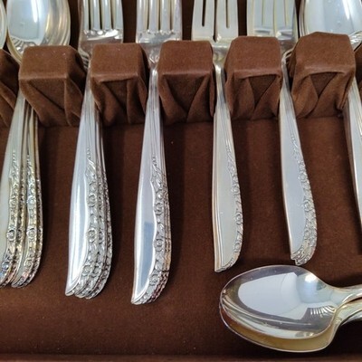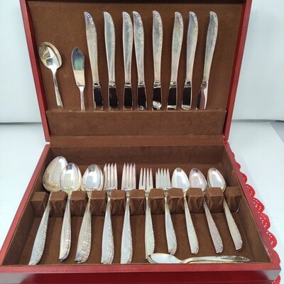 1965 Wm A ROGERS ONEIDA Brittany Rose Silverplated Silverware Set Of 52 Wood Box