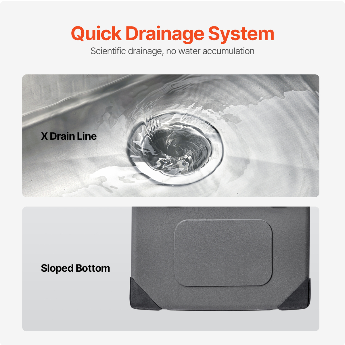 Quick Drainage System: Featuring a sloped bottom and X-shaped drain design, this prep bar sink is equipped with a drain kit to ensure quick drainage and prevent water accumulation. The standard drain opening fits any garbage disposal unit.