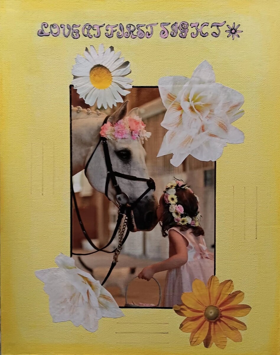 "Love at First Sight" is a stunning contemporary painting by Canadian artist Carla Dancey. Created in 2024, this original piece features a beautiful collage of a horse and a flower girl surrounded by flowers. The main colors are yellow, white, and pink, giving the painting a soft and romantic feel.