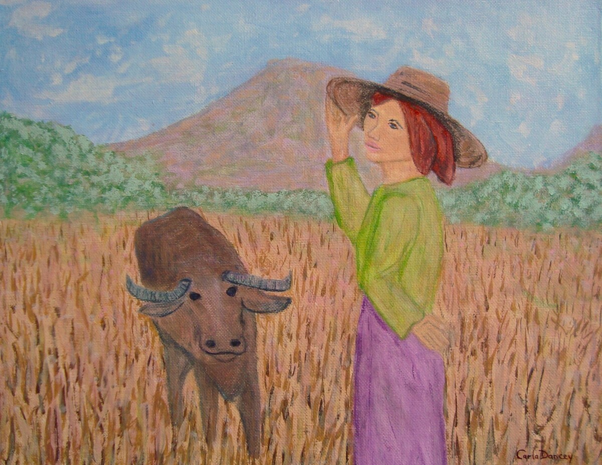 'In The Pasture' by Carla Dancey. This is an original acrylic painting on an 11" x 14" strong, durable, child and pet friendly canvas board. The painting is a landscape with a cow or bull standing next to a woman in a field with mountains and trees in the distance. The artwork is signed on the front as well as titled and signed on the back. Two coats of gloss varnish have been applied for years of added protection. The painting comes with a hanger attached so you can hang it with or without a frame.