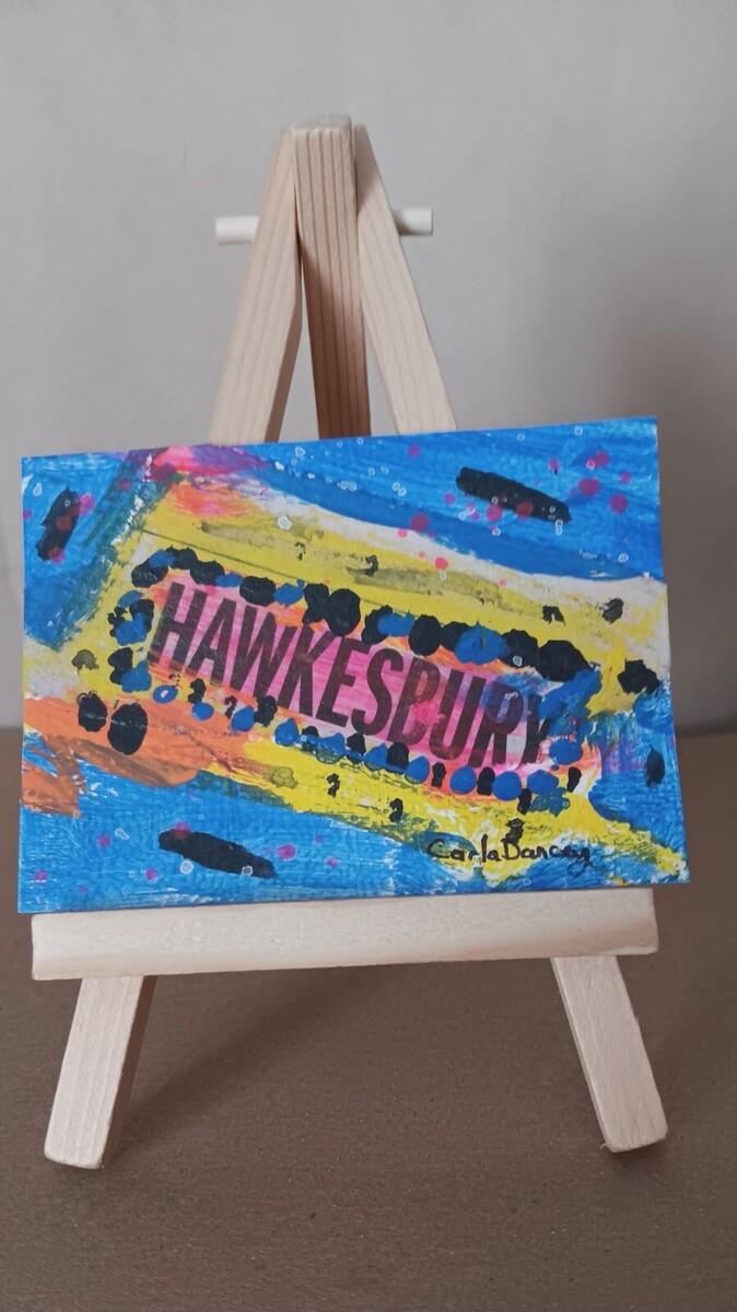 This unique and original piece of art titled "ENTE A L'HGH" is a small, one of a kind (OOAK) acrylic painting collage by Canadian artist Carla Dancey. Measuring 2.5 inches in height by 3.5 inches in length, this contemporary work features abstract expressionism, French text, and mixed media elements including pen and collage.