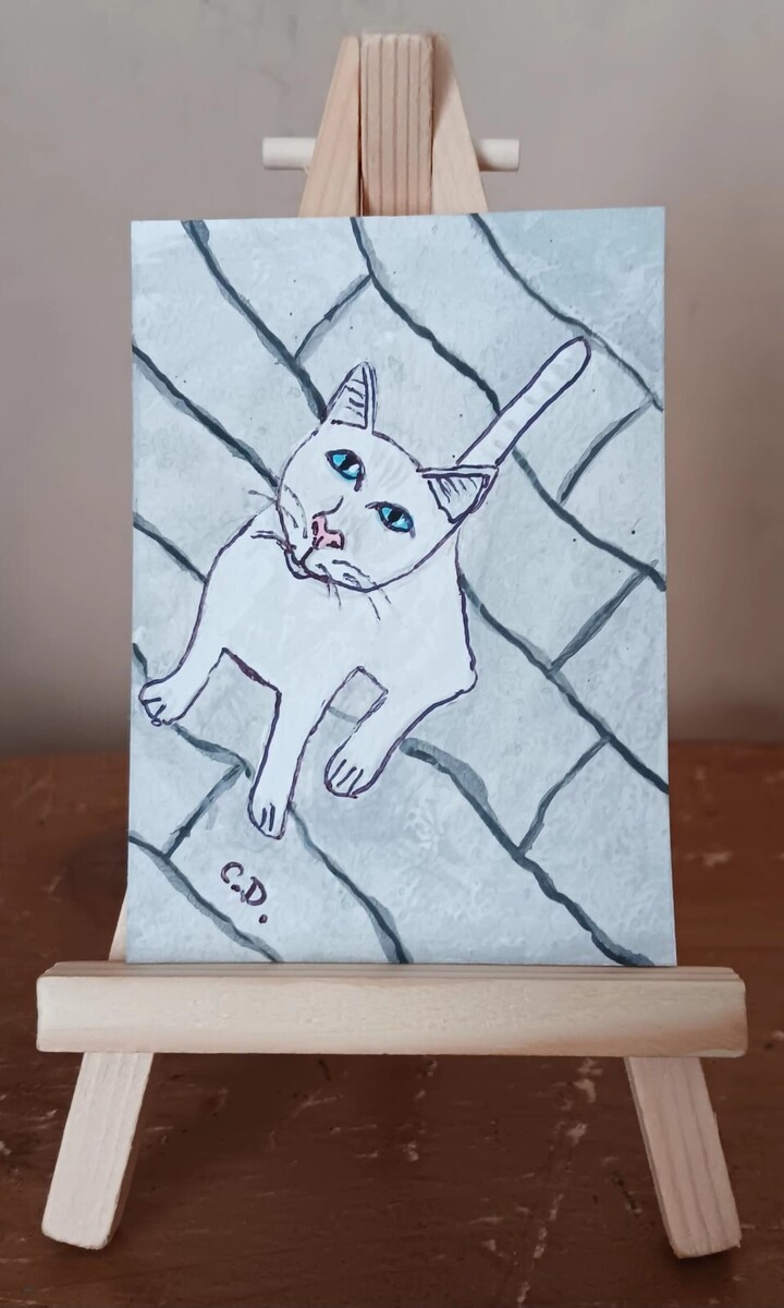 This ACEO original painting features a white cat relaxing on a patio, captured by artist Carla Dancey. Measuring 3.5" x 2.5", this miniature artwork is painted with acrylic on artist paper and comes with a certificate of authenticity issued by the artist. It is also signed and is a one-of-a-kind collectible piece.
