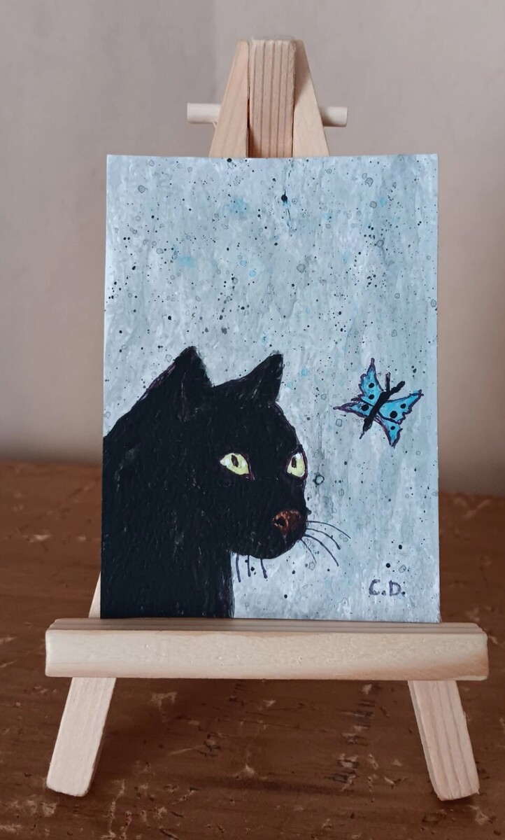 ACEO Original Black Cat And Butterfly and 50 similar items