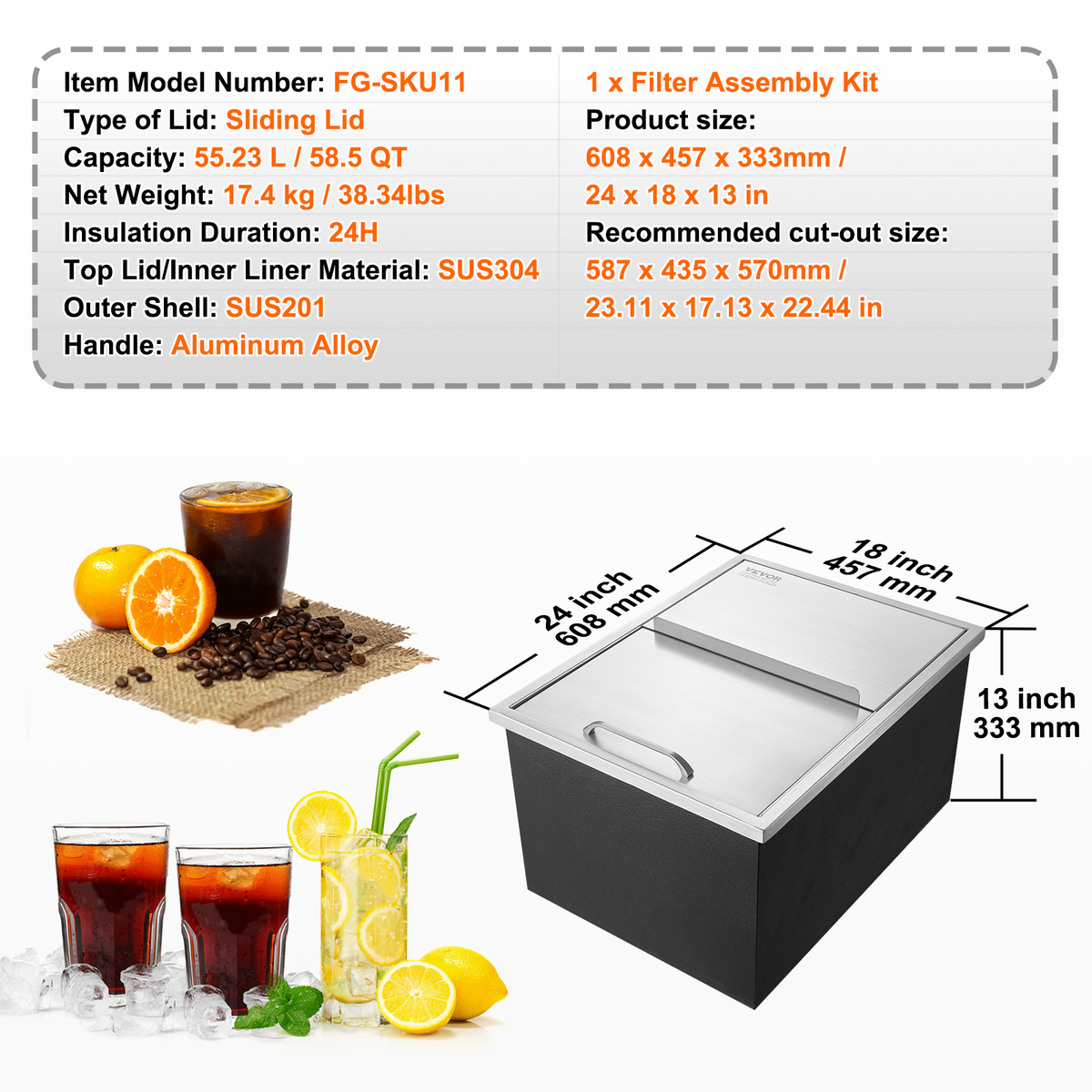 Large Capacity: A large-capacity drop in ice bin that can hold about 58.5QT (55.23L) of ice. When filled, it can make approximately 234 cups of 16oz beverages. Ideal for storing a large amount of ice or chilling various drinks.