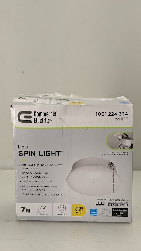 Commercial Electric's 7 in. Pull Chain Spin Light Integrated LED Flush Mount Ceiling Light converts incandescent lights to energy-efficient LED fixture. This Spin Light is designed to simply screw into most existing plastic and porcelain lamp holders without any wiring required. Converts your lamp holder to a fixture in no time at all. *Direct wire option is available using bracket included in box. For quick activation, use the pull chain for an easy grab; add a decorative finial at the end to grasp as well. This fixture emits 830 Lumens of brightness using only 11-Watt of energy saving electricity, the environment and your wallet. Great for closets, bathrooms, stairways, basement, garage, attic or laundry room.