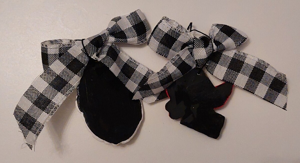 This is a new set of 2 hand-painted three-dimensional ceramic Christmas tree ornaments featuring Santa and a bird. All are painted using mainly black, red, white, green, and gold. They have a clear overlay to protect the paint. (The backs are plain black). Black and White Buffalo Plaid ribbons and hanging cords are attached to each ornament. They each measure around 3? in height. We are a smoke-free home.