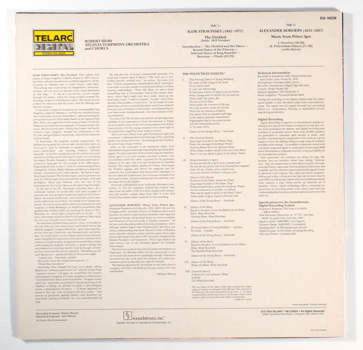 The Firebird/Overtures And Polovetsian Dances, by Robert Shaw, features a vibrant performance of Igor Stravinsky?s The Firebird suite, derived from the 1910 ballet, alongside selections from Alexander Borodin?s opera Prince Igor, performed by the Atlanta Symphony Orchestra and Chorus. Shaw?s interpretation, released in 1980 by Telarc, is celebrated for its dynamic range and clarity, showcasing his mastery in choral and orchestral direction. Historically, The Firebird marked Stravinsky?s breakthrough as a composer, establishing him as a leading figure in 20th-century music, while Borodin?s Polovetsian Dances are noted for their exotic orchestration and influence on later musical theater. The album itself did not produce hit singles, as it is a classical recording focused on orchestral and choral works rather than commercial singles. This release remains significant for its high-fidelity recording quality, a hallmark of Telarc?s early digital recordings.