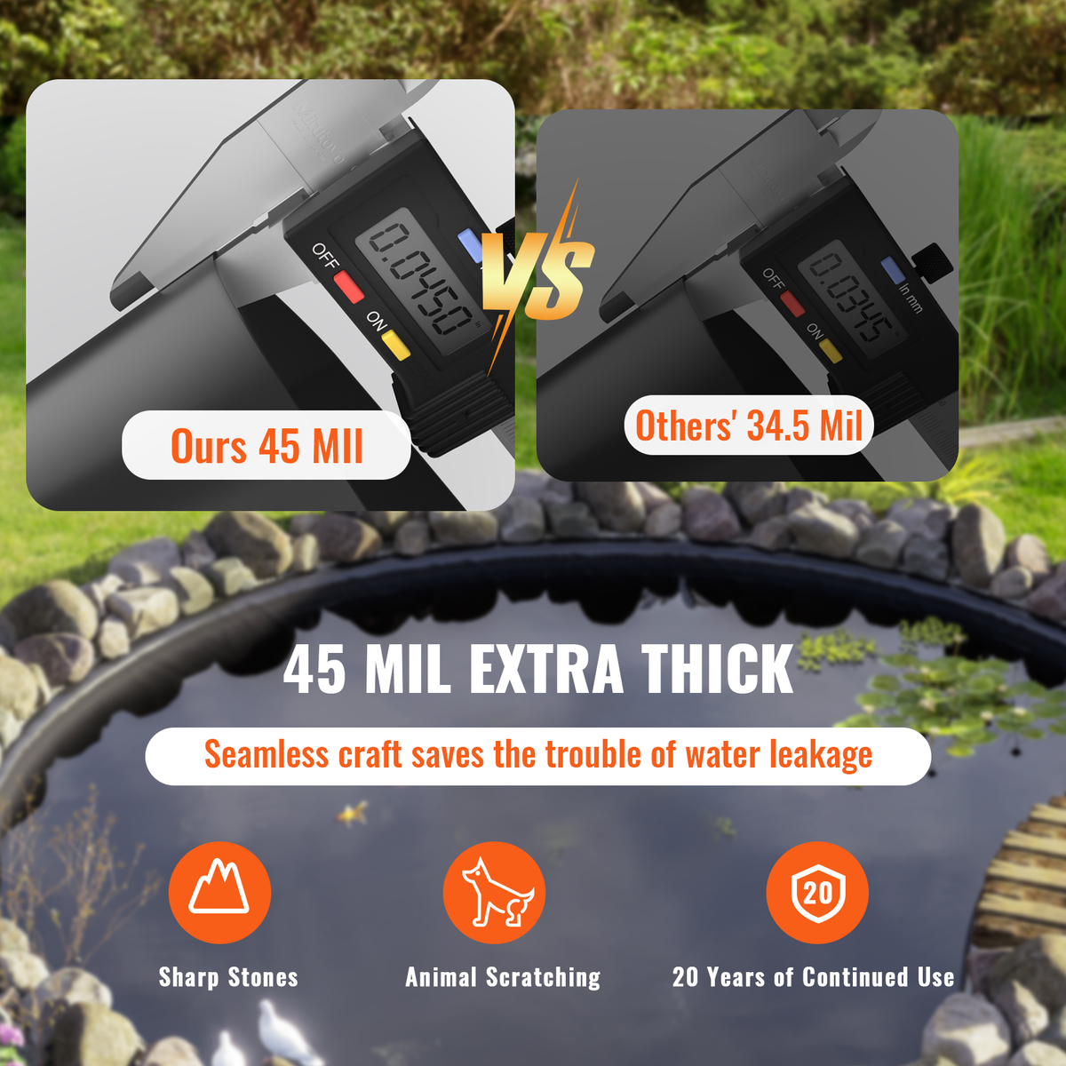 45 Mil Super Thick: The pond liner is 10' x 15' in size and is designed to be puncture and tear-resistant. This means that you don't have to worry about sharp rocks or root growth damaging the liner. Additionally, the liner provides a flat surface and reduces soil buildup, which makes cleaning your pond easier and quicker.